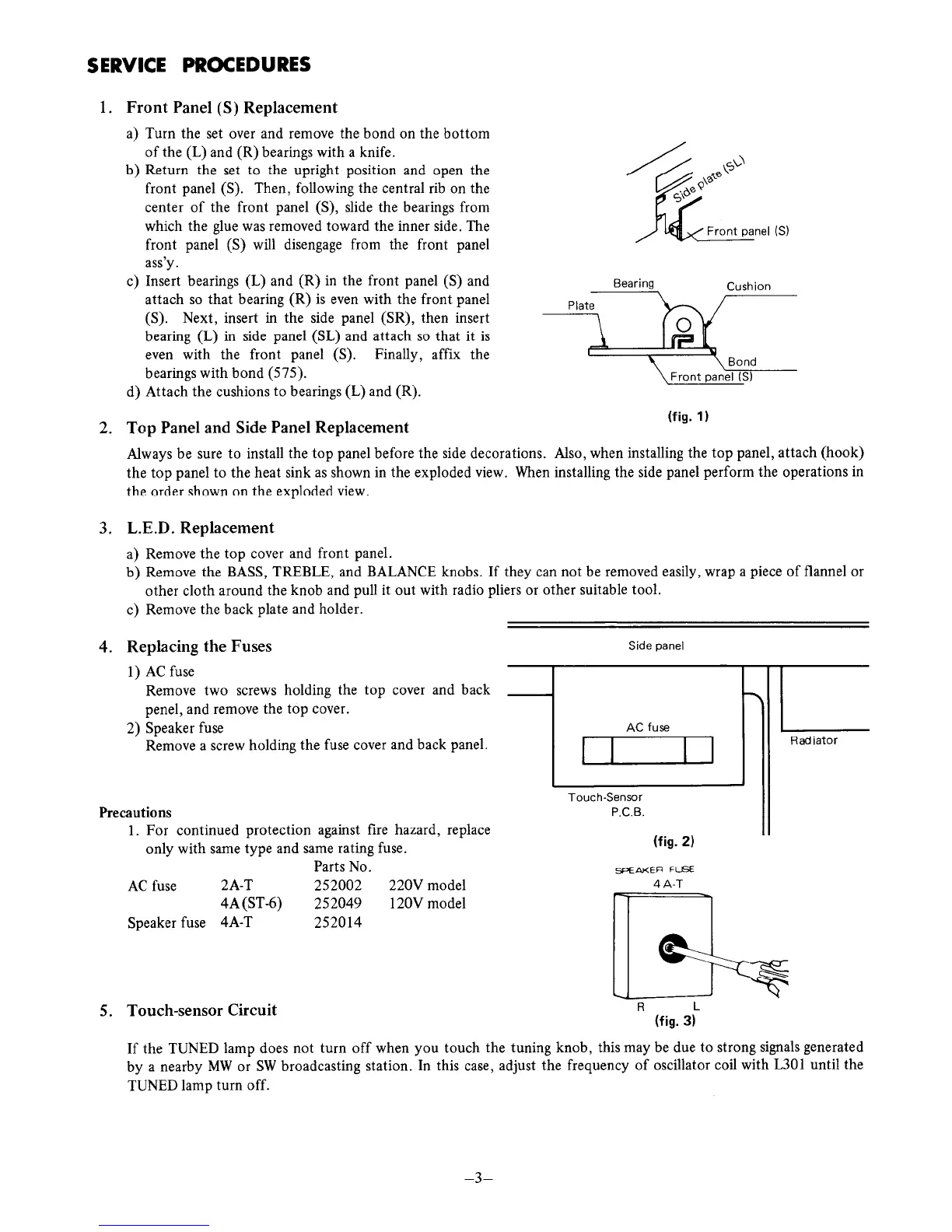 Onkyo TX-20 - Service Procedures; Front Panel (S) Replacement; Top Panel and Side Panel Replacement; L.E.D. Replacement