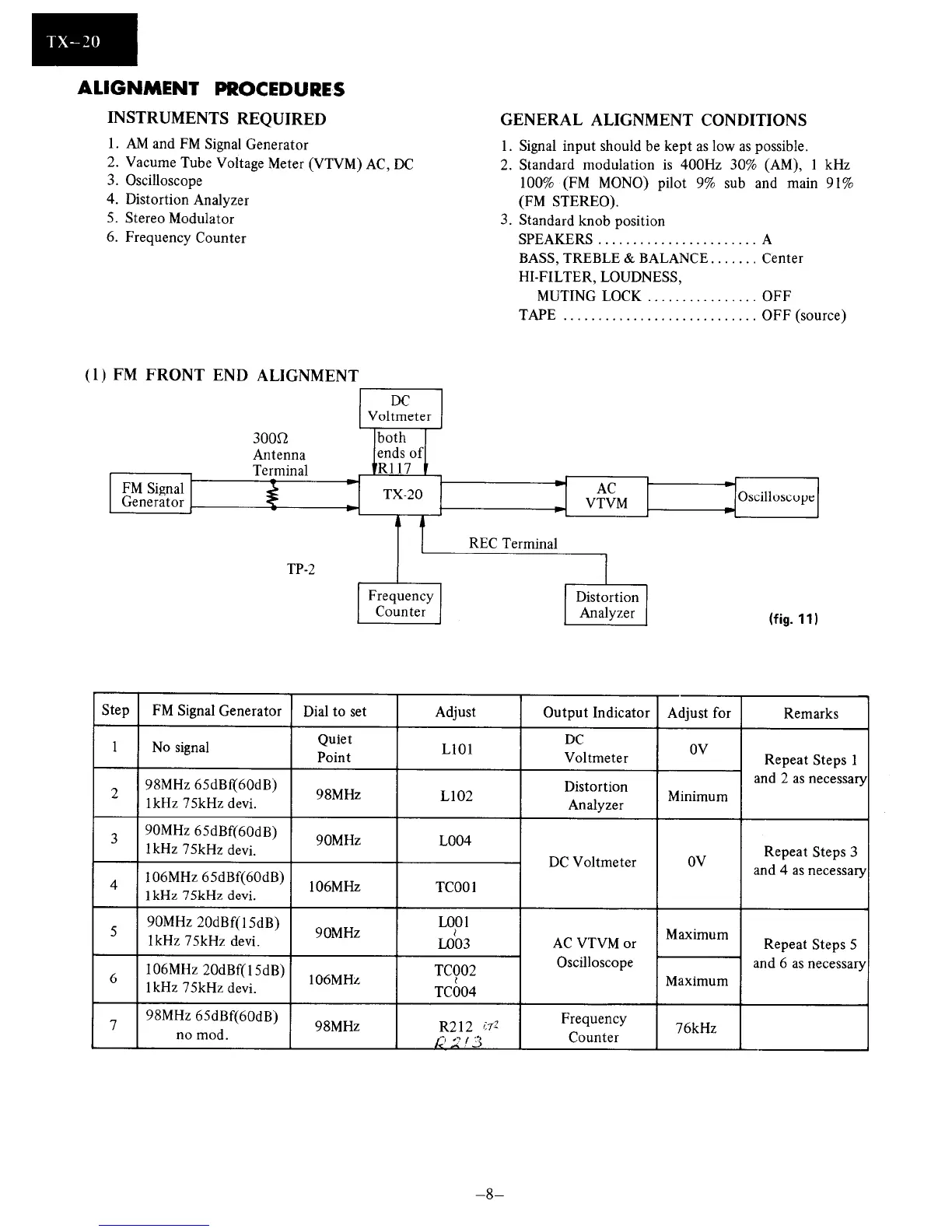 Onkyo TX-20 - Alignment Procedures; Instruments Required; General Alignment Conditions; FM Front End Alignment