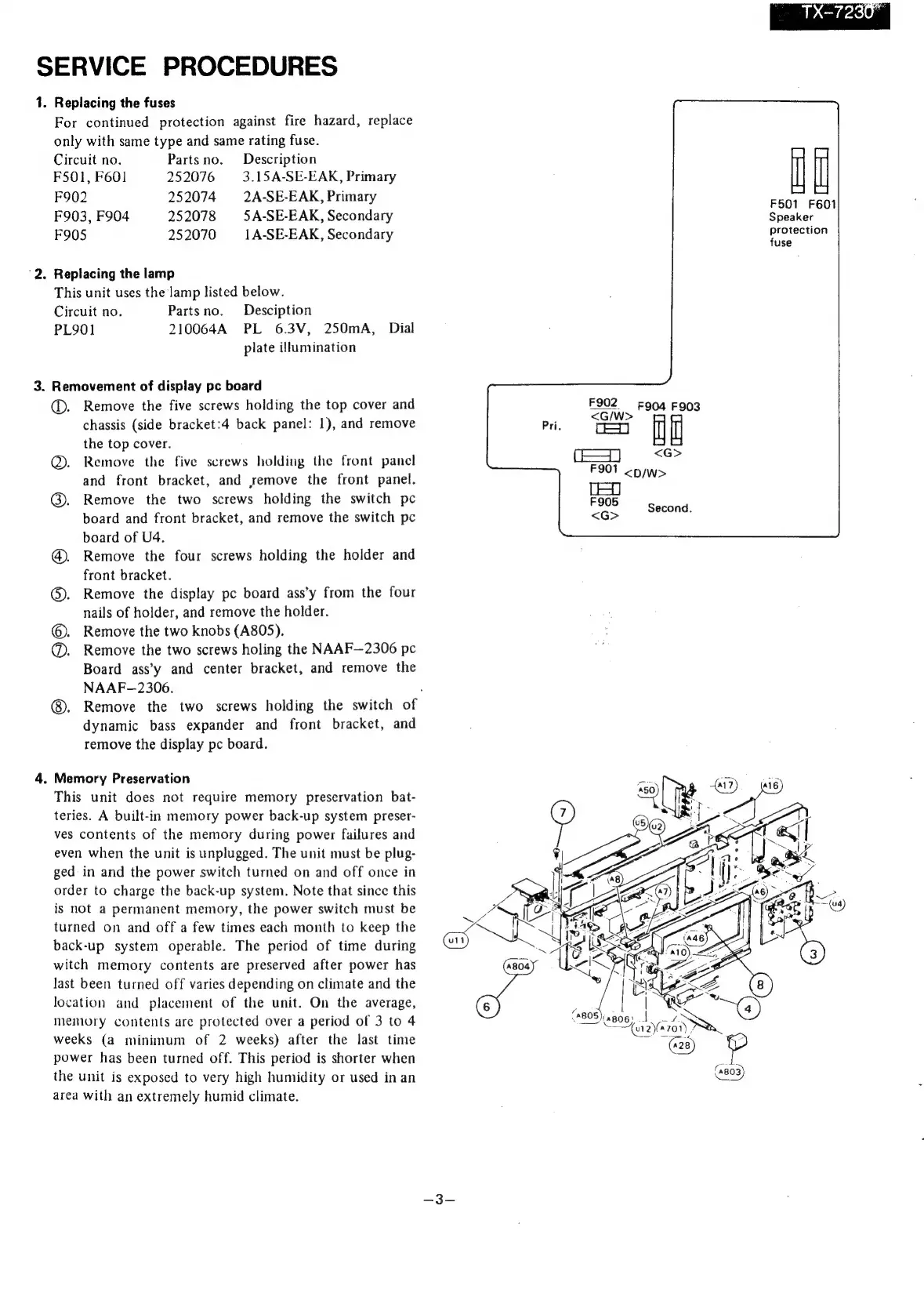 Onkyo TX-7230 - Service Procedures; Replacing Fuses; Replacing Lamps; Display PC Board Removal