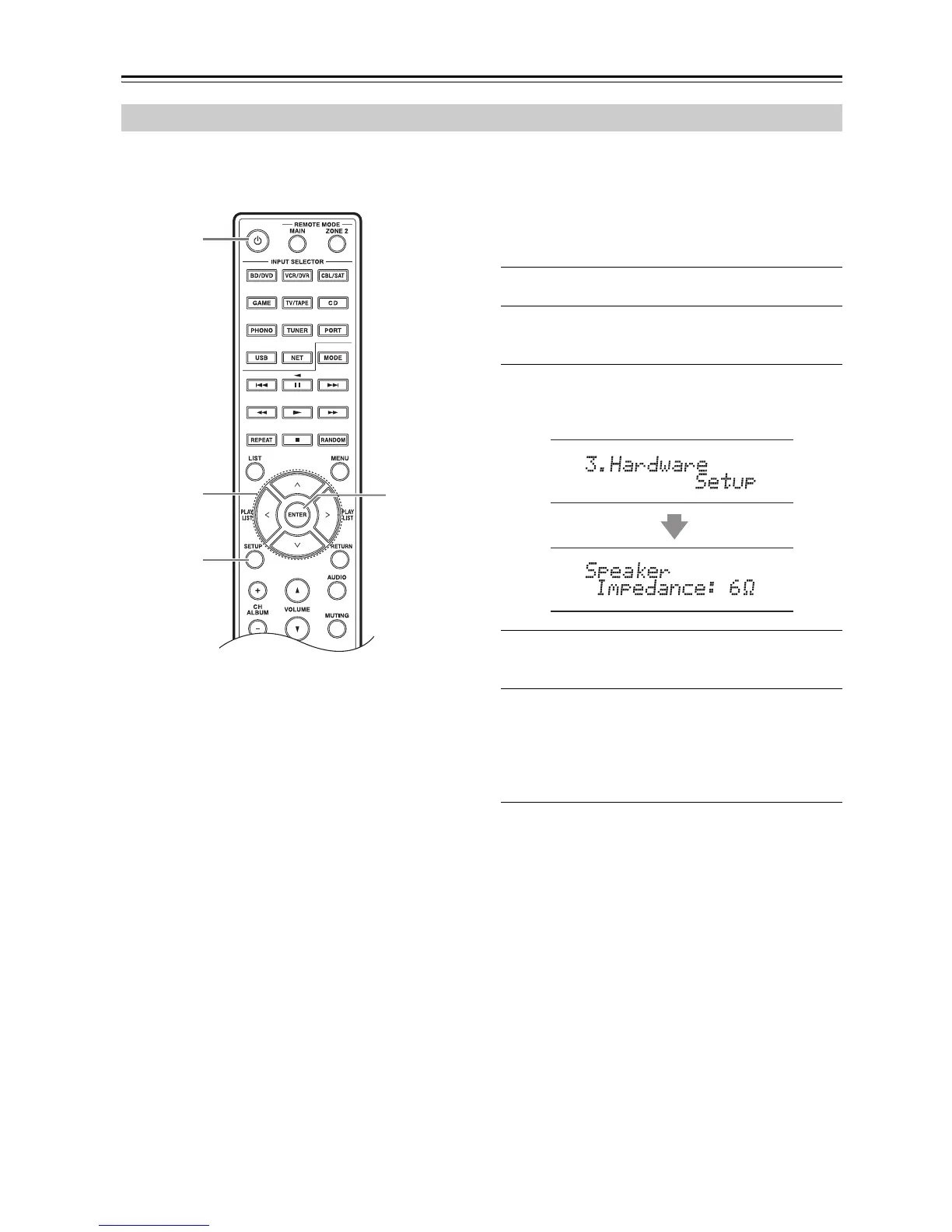 On the receiver, the factory default for speaker impedance is “6 Ω”. If you need to change the speaker impedance setting,