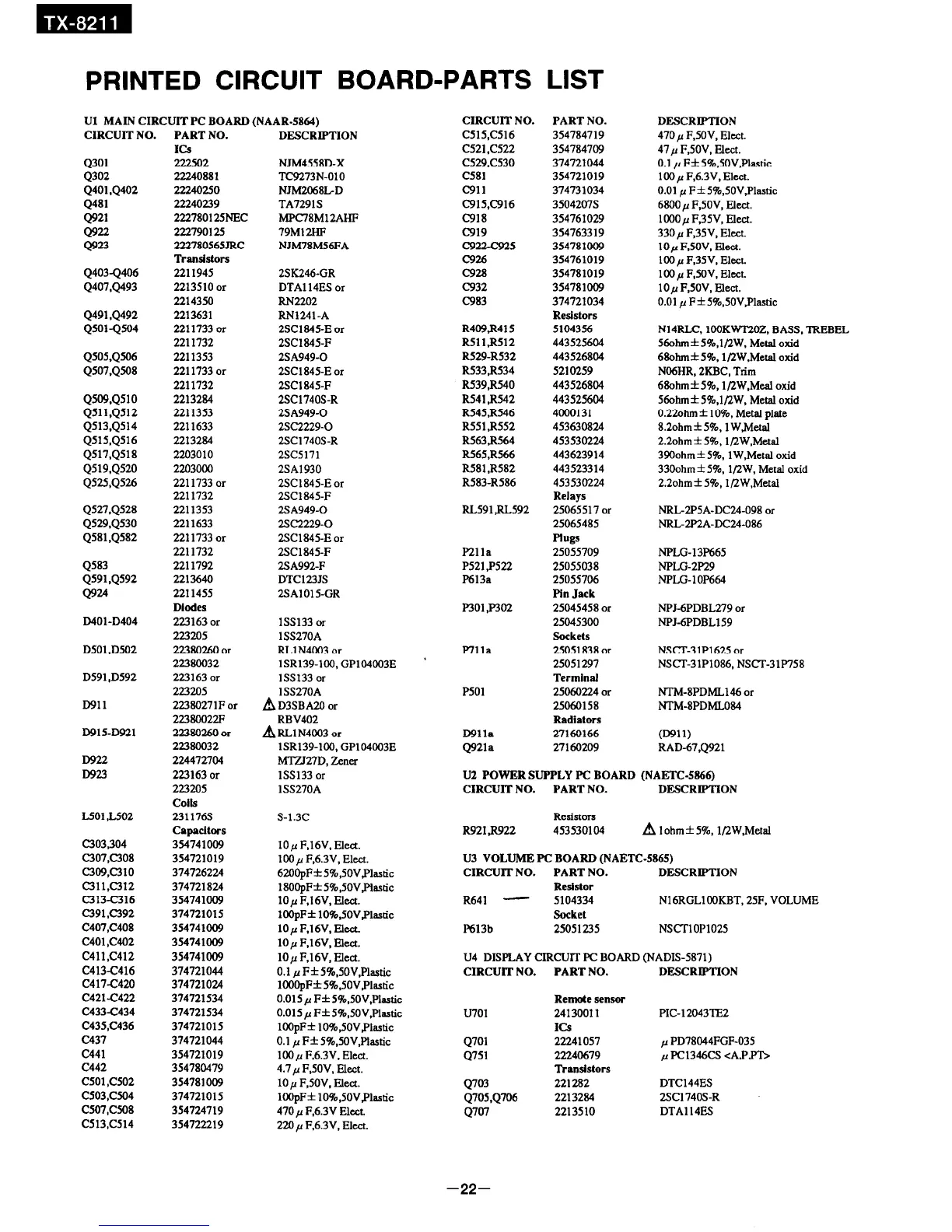 Onkyo TX-8211 - Printed Circuit Board Parts List - Main Section; U1 Main Circuit Board Parts; U2 Power Supply Board Parts; U3 Volume Board Parts