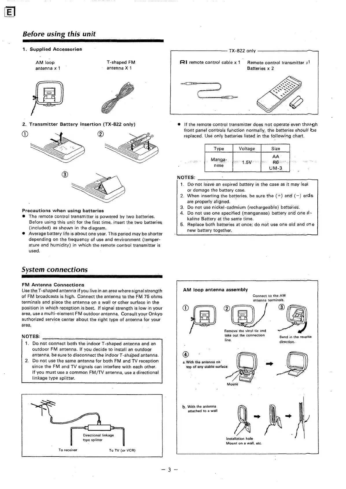 Onkyo TX-822 - Before Using This Unit; Supplied Accessories; Transmitter Battery Insertion (TX-822 only); Battery Precautions