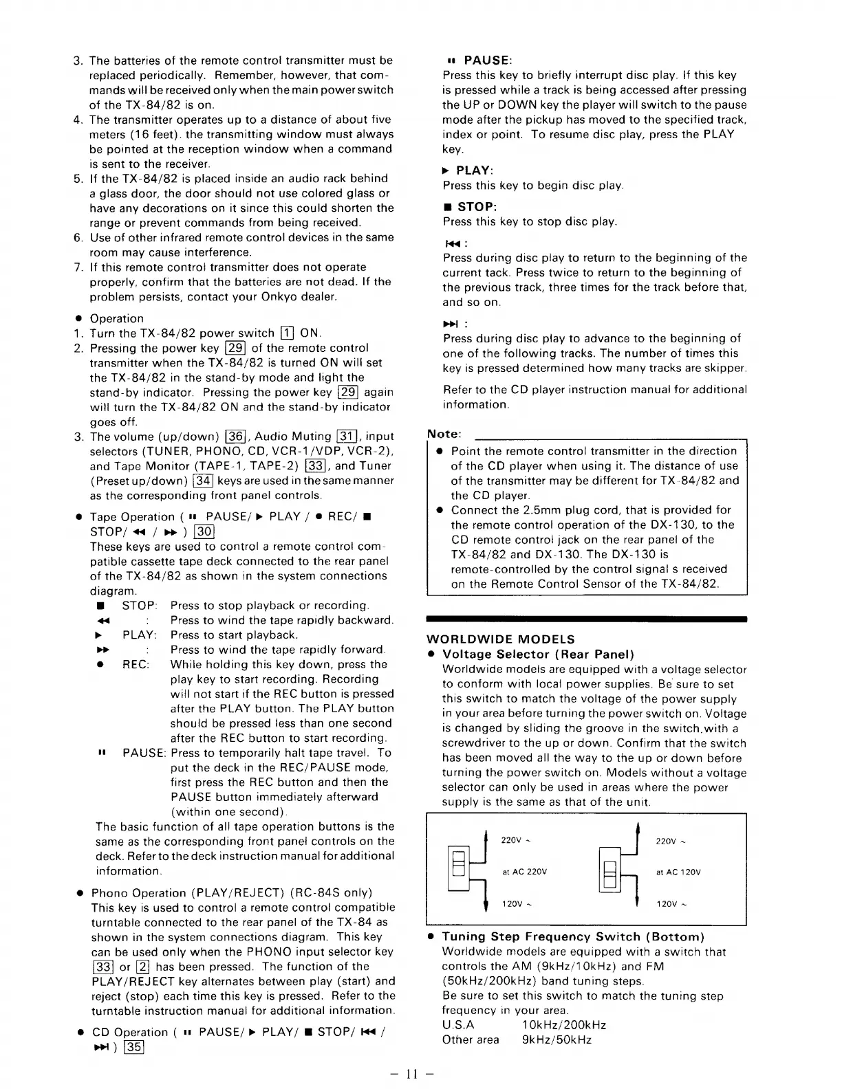 Onkyo TX-84 - Using the Remote Control Transmitter; Operation; Tape Operation; Phono Operation (PLAY;REJECT) (RC-84 S only)