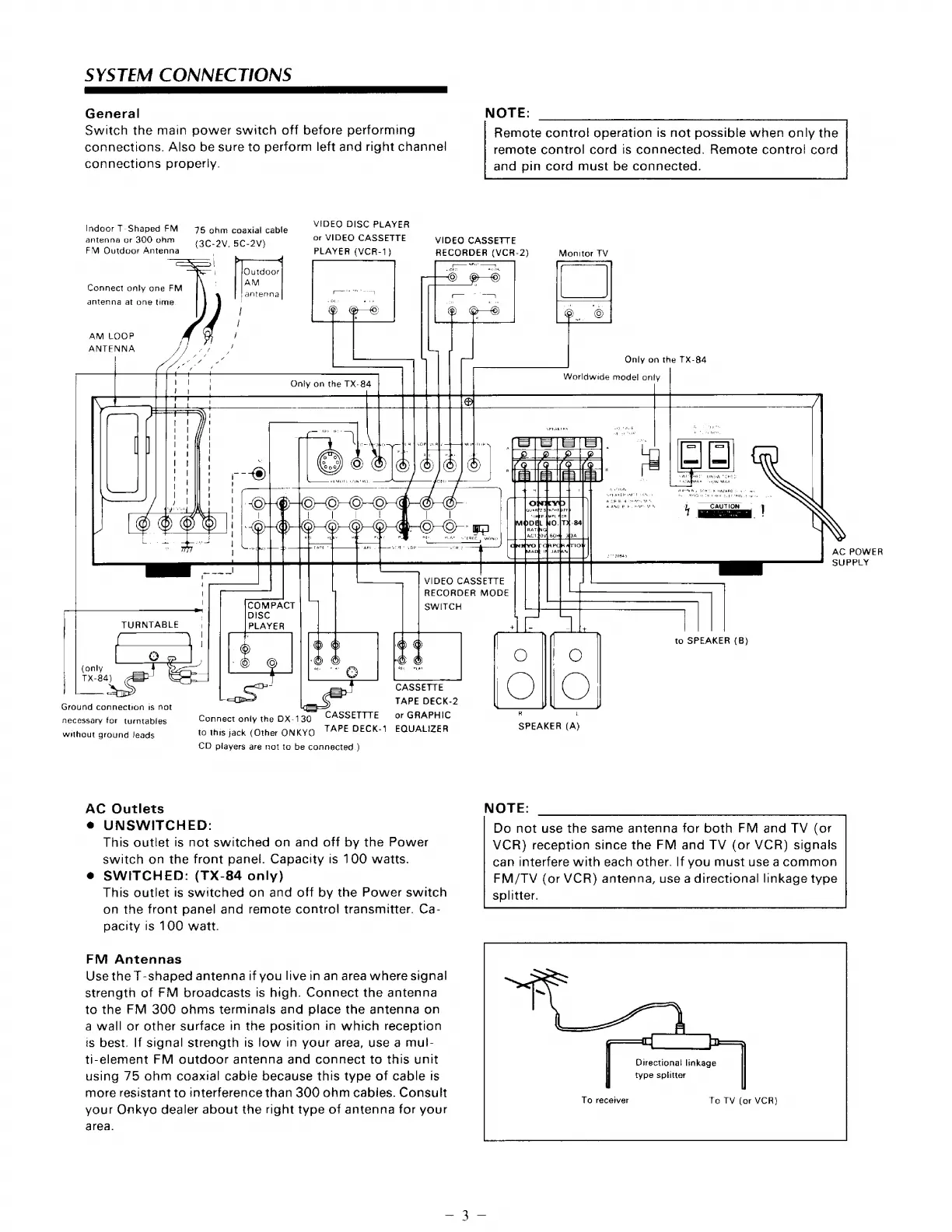Onkyo TX-84 - SYSTEM CONNECTIONS; General; FM Antennas
