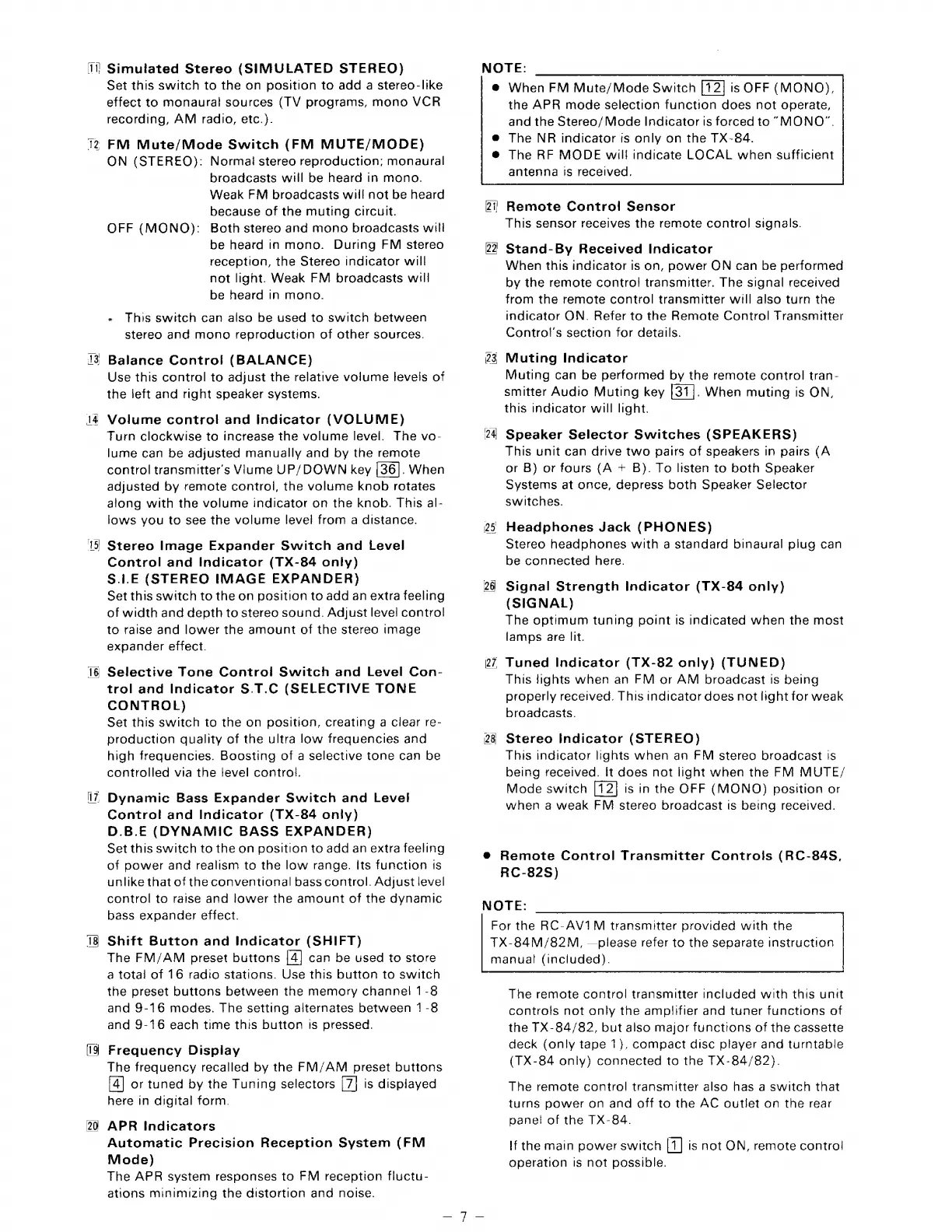 Onkyo TX-84 - FRONT PANEL FACILITIES; 12 FM Mute;Mode Switch (FM MUTE;MODE); 14 Volume control and Indicator (VOLUME); 15 Stereo Image Expander Switch and Level Control and Indicator (TX-84 only)