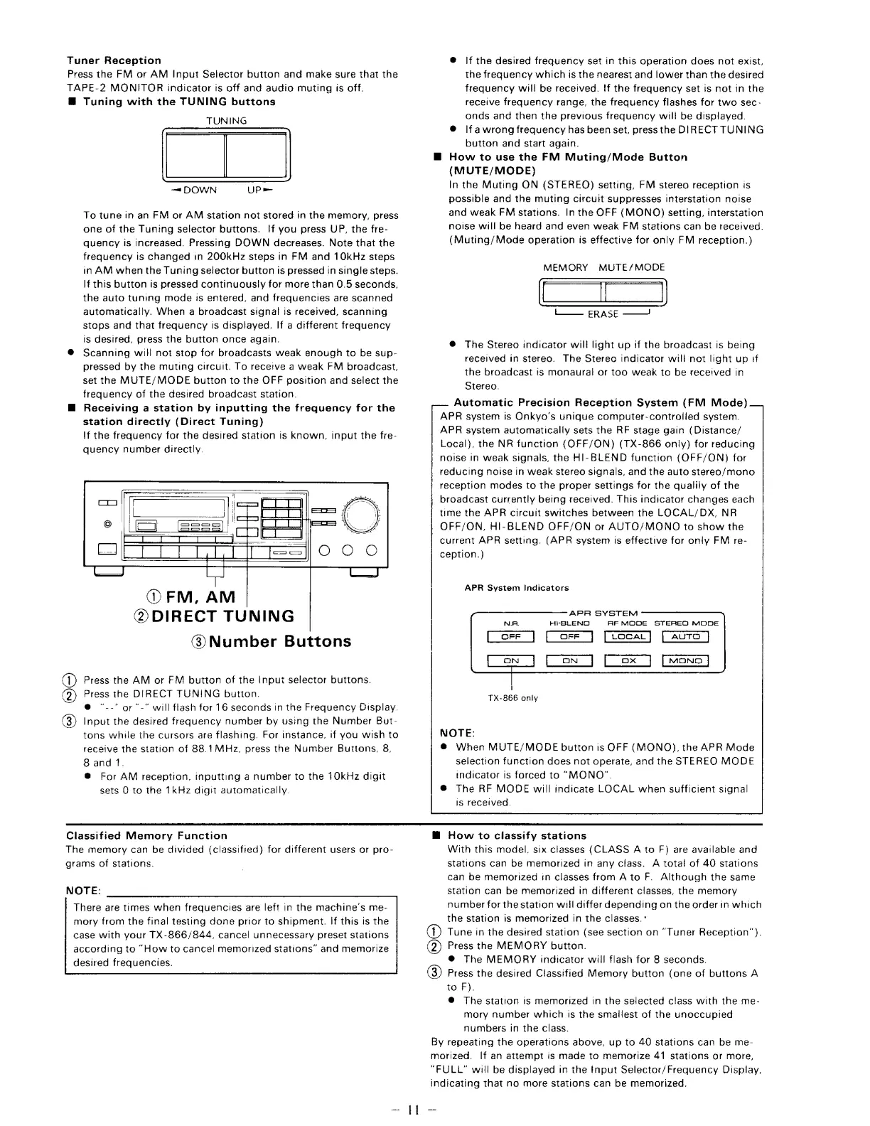 Onkyo TX-844 - Tuner and Reception Operations; Memory and Station Classification