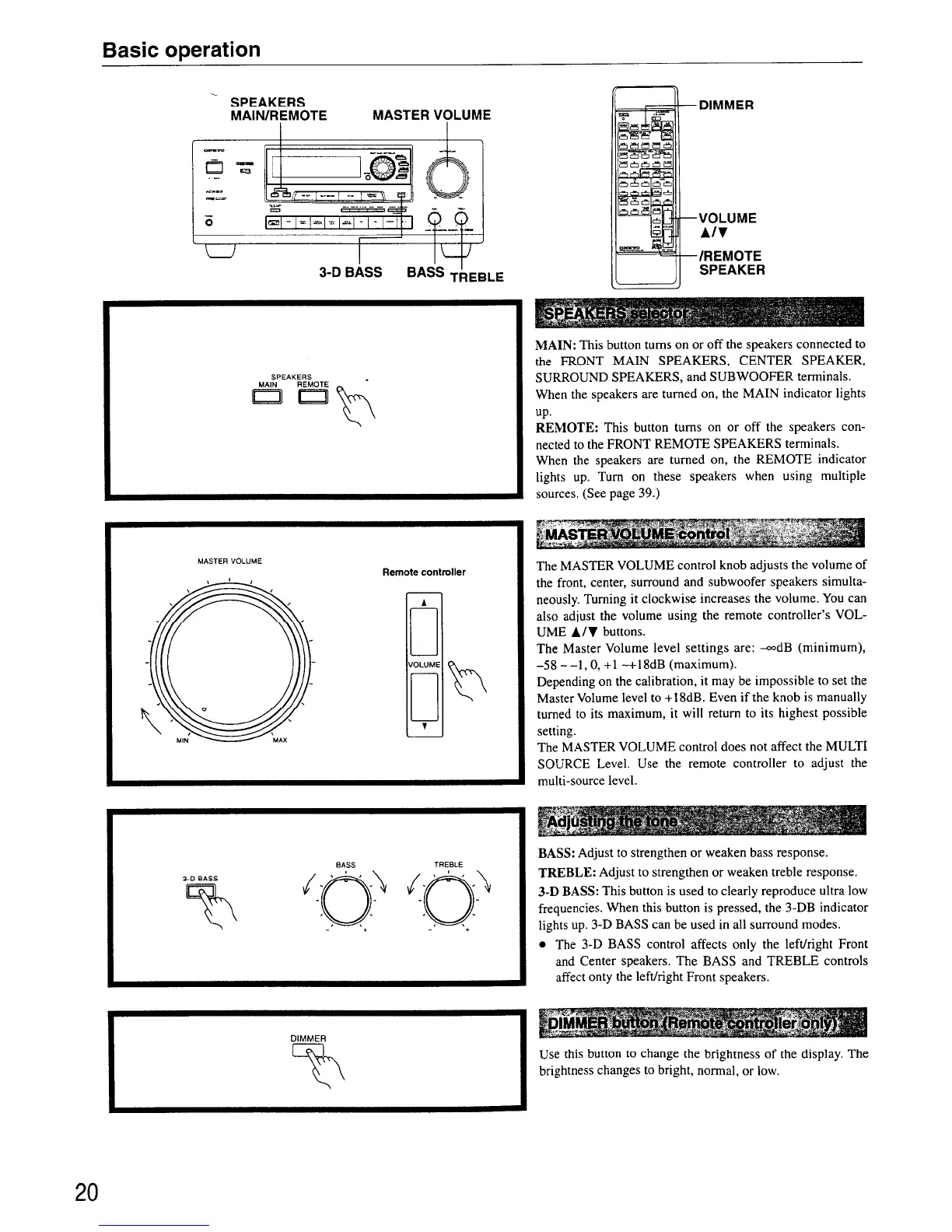 Onkyo TX-DS555 - Basic Operation: Speaker Select and Tone; Speaker Selection and Master Volume Control; Tone Adjustment and Display Dimming