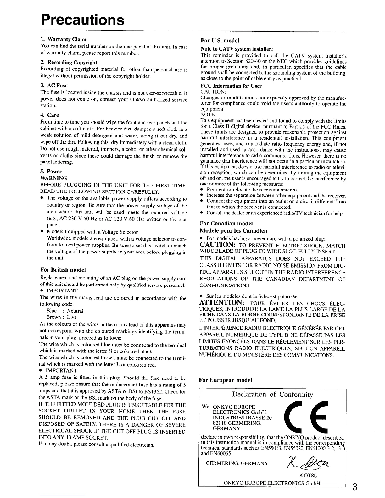 Onkyo TX-DS555 - Precautions; Warranty, Copyright, and AC Fuse Information; Unit Care, Power Voltage, and Model-Specific Safety