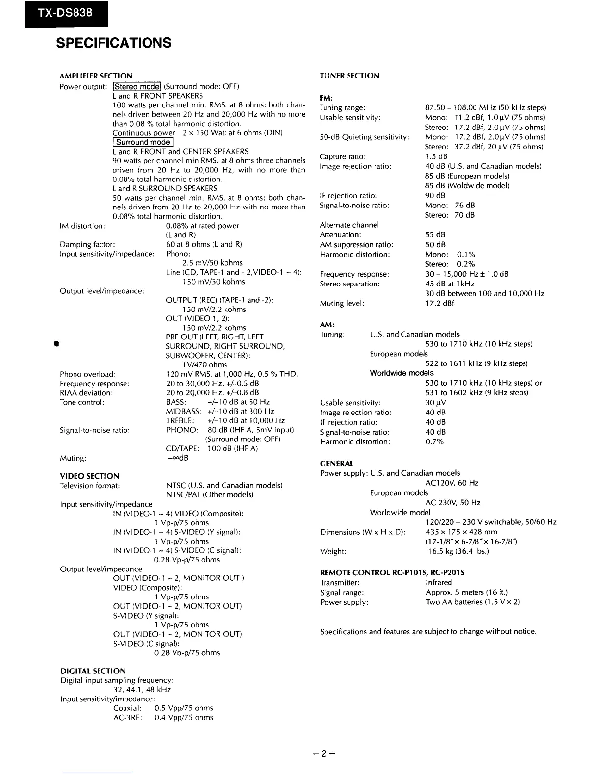 Onkyo TX-DS838 - SPECIFICATIONS; AMPLIFIER SECTION; TUNER SECTION; GENERAL