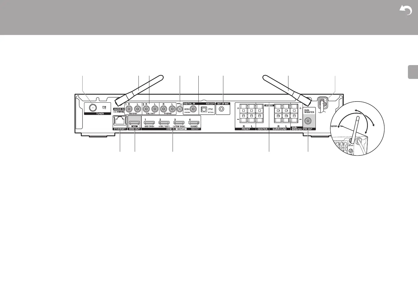 SPEAKERS terminals: Connect speakers or passive subwoofers with speaker cables.