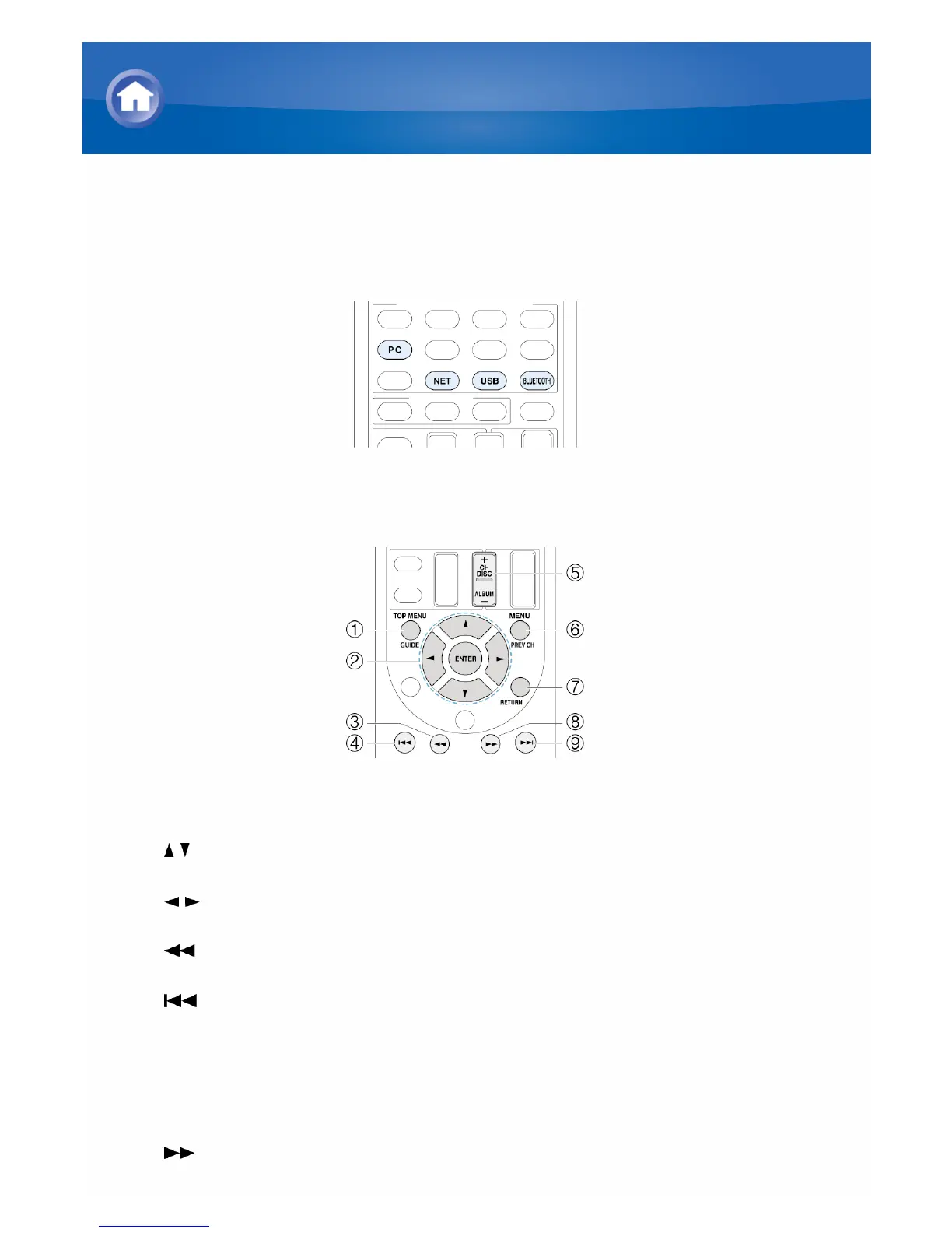 1 TOP MENU: This button displays the top menu for each media or