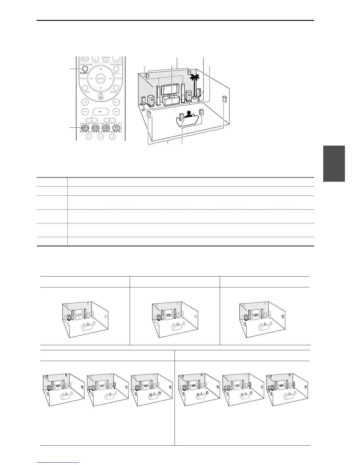 The illustration shows which speakers are activated in each channel. See “Speaker Configuration” for the speaker setup