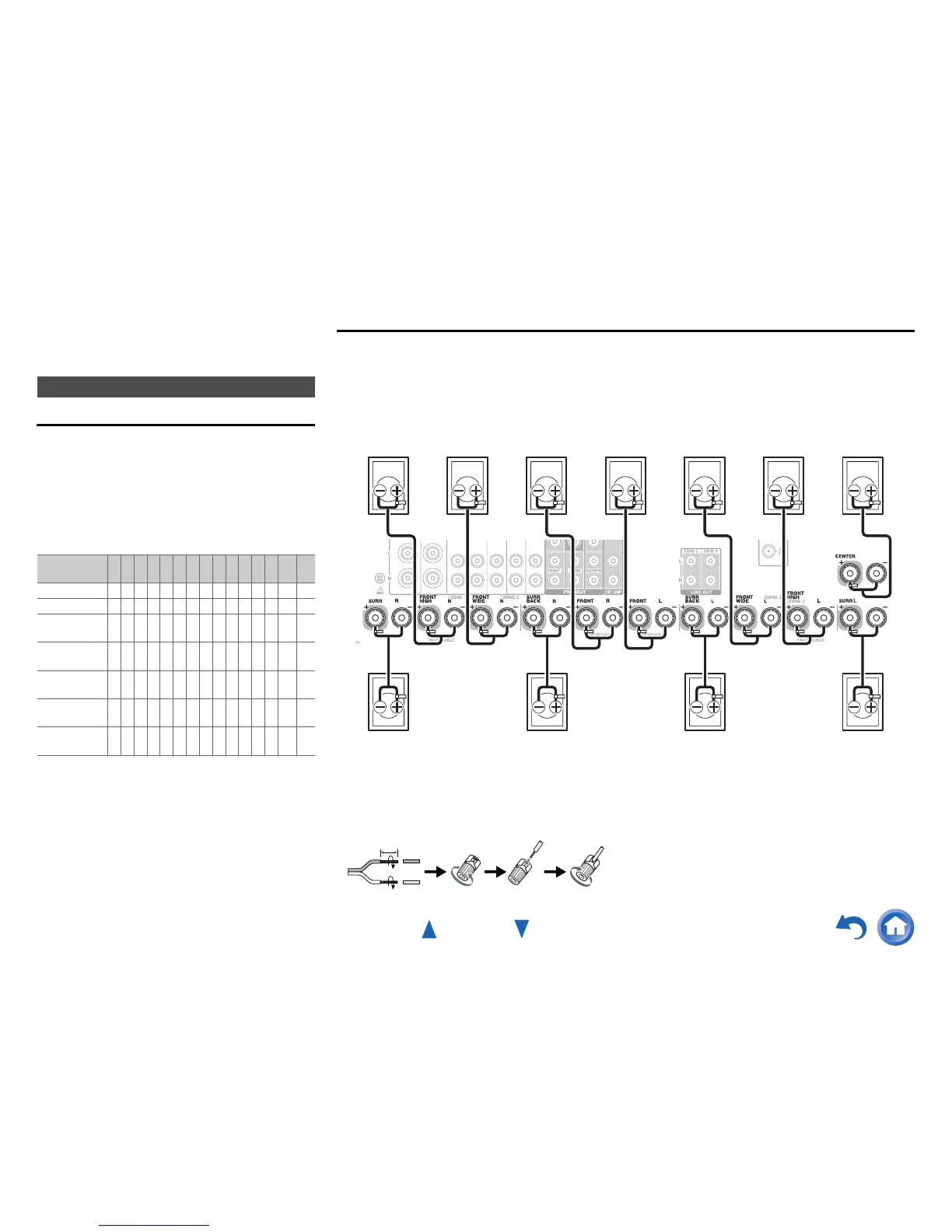The following illustration shows how to connect the speakers to each pair of terminals. If you’re using only one surround