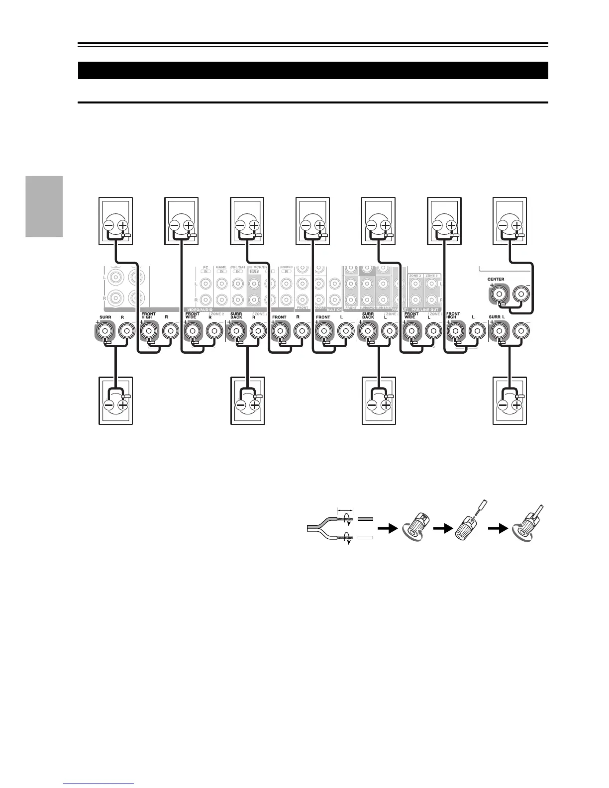 The following illustration shows how to connect the speakers to each pair of terminals. If you’re using only one surround