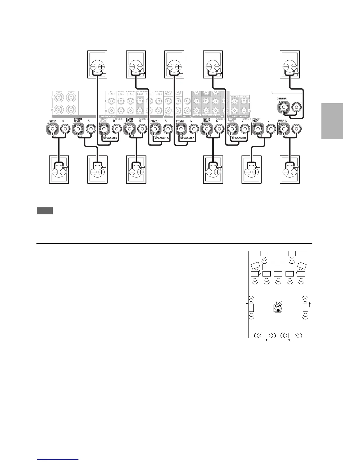 The following illustration shows how to connect the speakers for up to 7.2-channel playback with Speakers A or