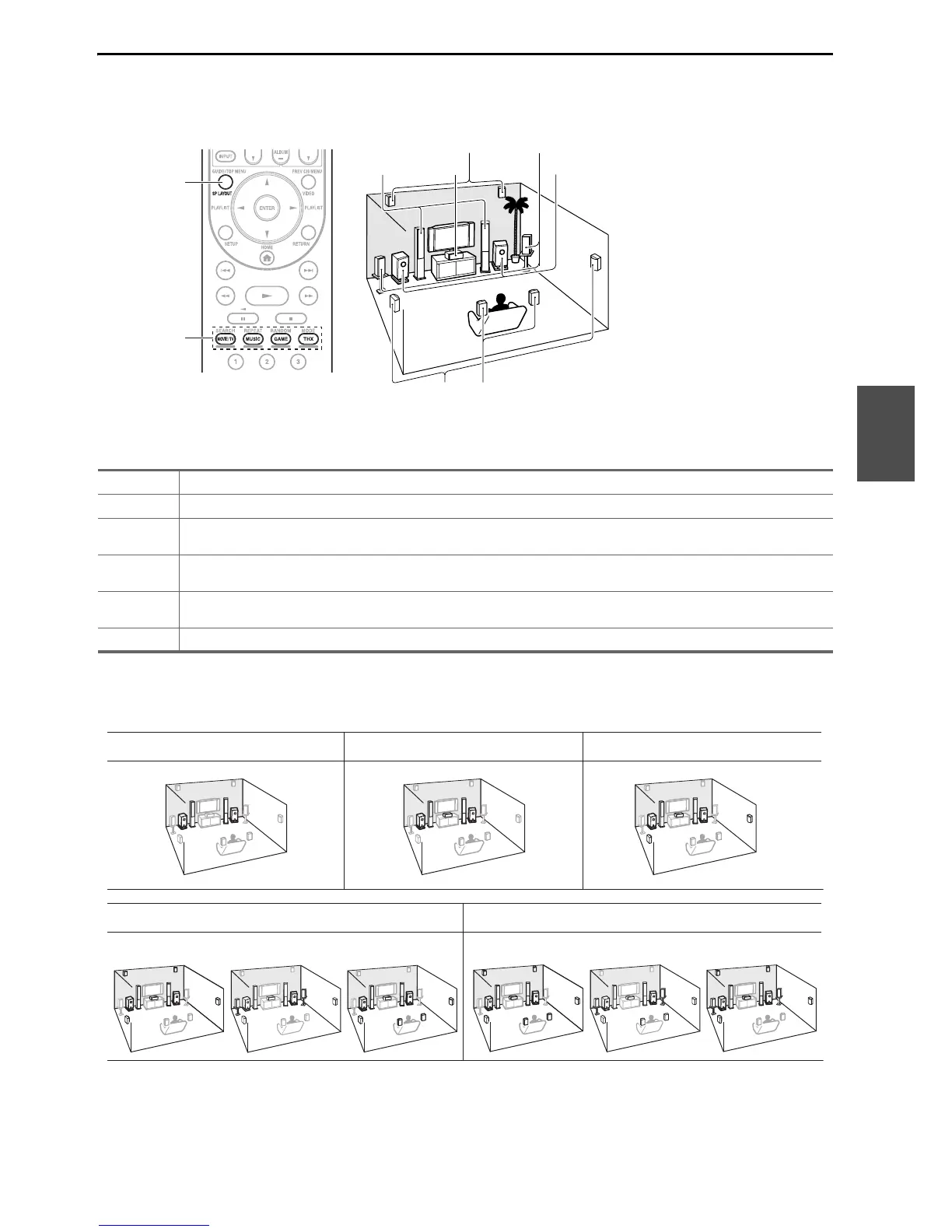 The illustration shows which speakers are activated in each channel. See “Speaker Configuration” for the speaker setup