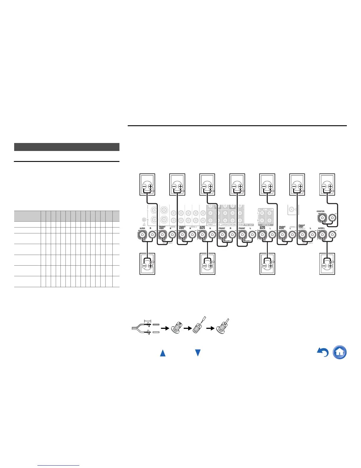 The following illustration shows how to connect the speakers to each pair of terminals. If you’re using only one surround