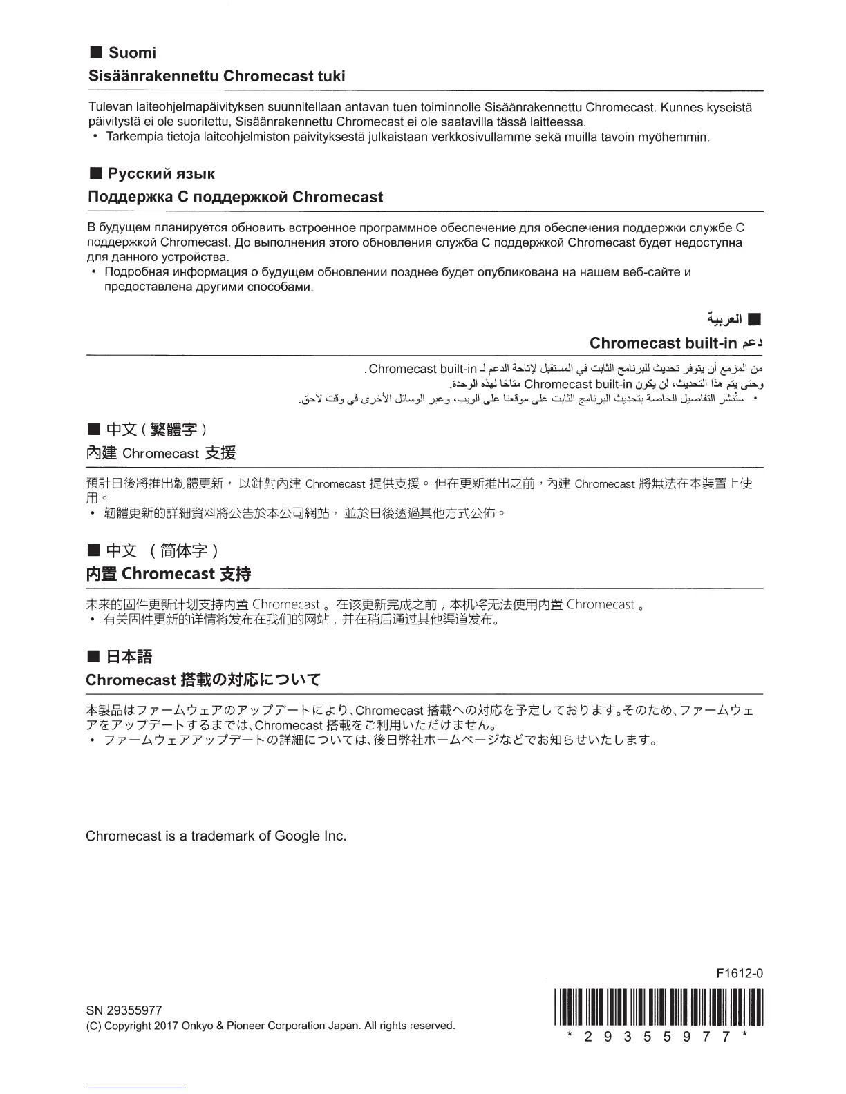 paivitysta ei ole suoritettu, Sisaanrakennettu Chromecast ei ole saatavilla tassa laitteessa.