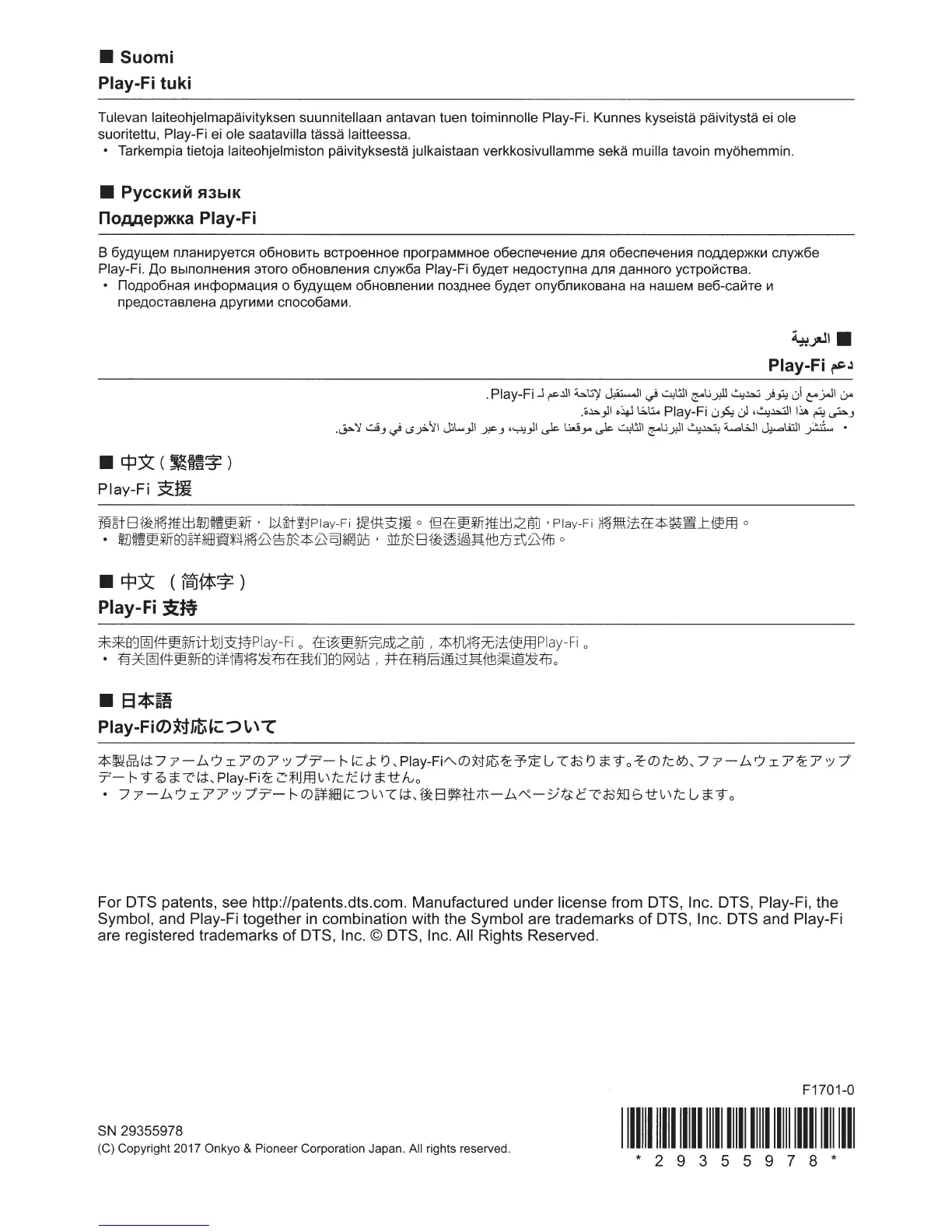 For DTS patents, see http://patents.dts.com. Manufactured under license from DTS, Inc. DTS, Play-Fi, the