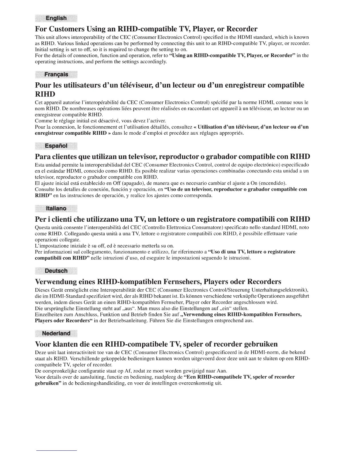 as RIHD. Various linked operations can be performed by connecting this unit to an RIHD-compatible