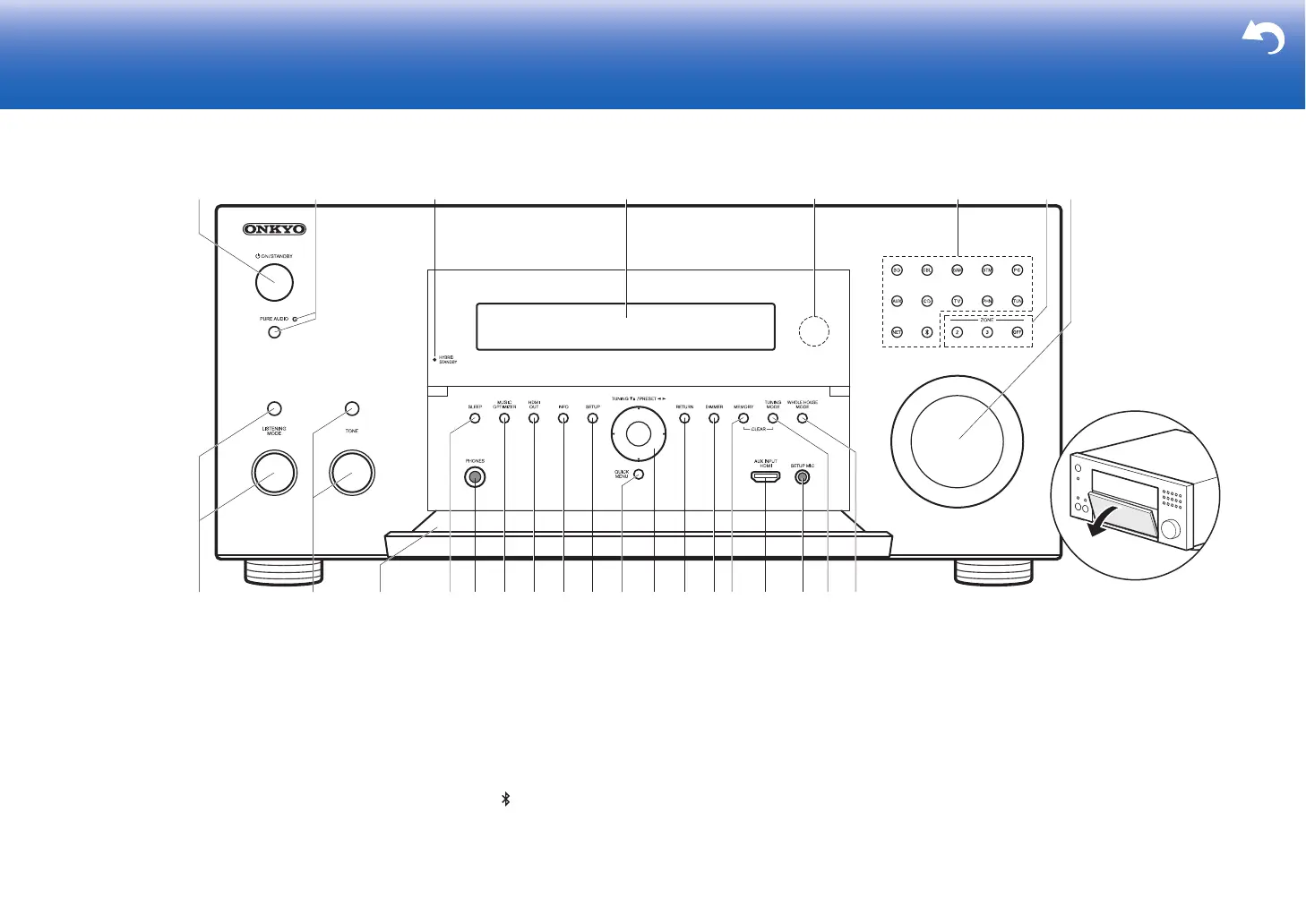 2. PURE AUDIO button/indicator: Switches the unit to Pure