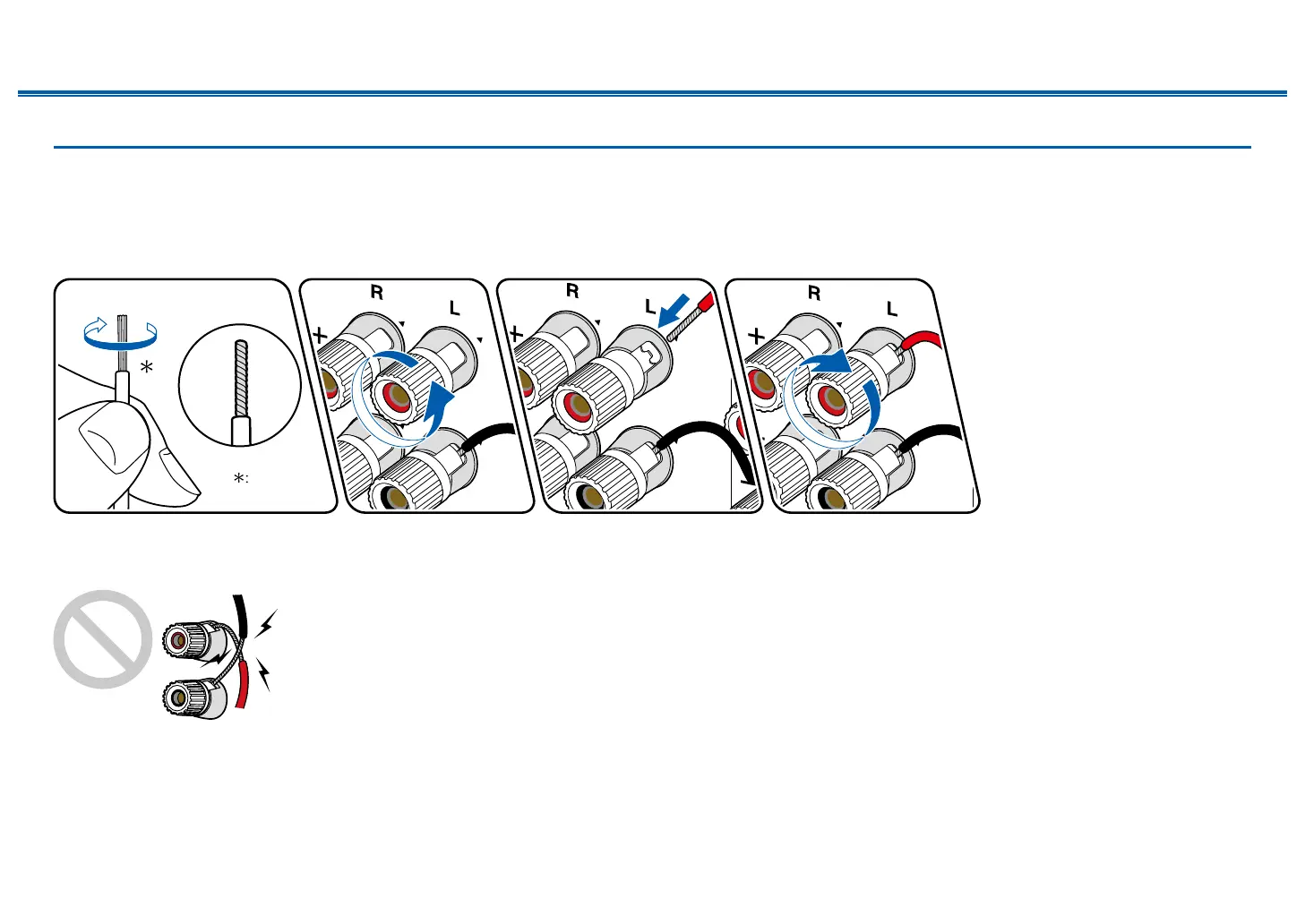 will not be reproduced properly due to reverse phase. Twist the wires exposed from the tip of the speaker cable so that the wires do not stick out of the speaker terminal