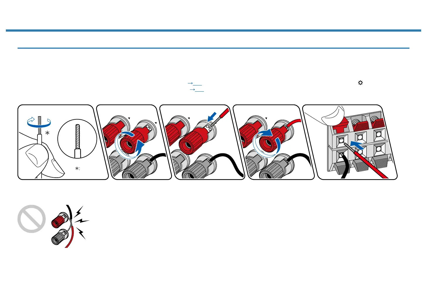 will not be reproduced properly due to reverse phase. Twist the wires exposed from the tip of the speaker cable so that the wires do not stick out of the speaker terminal