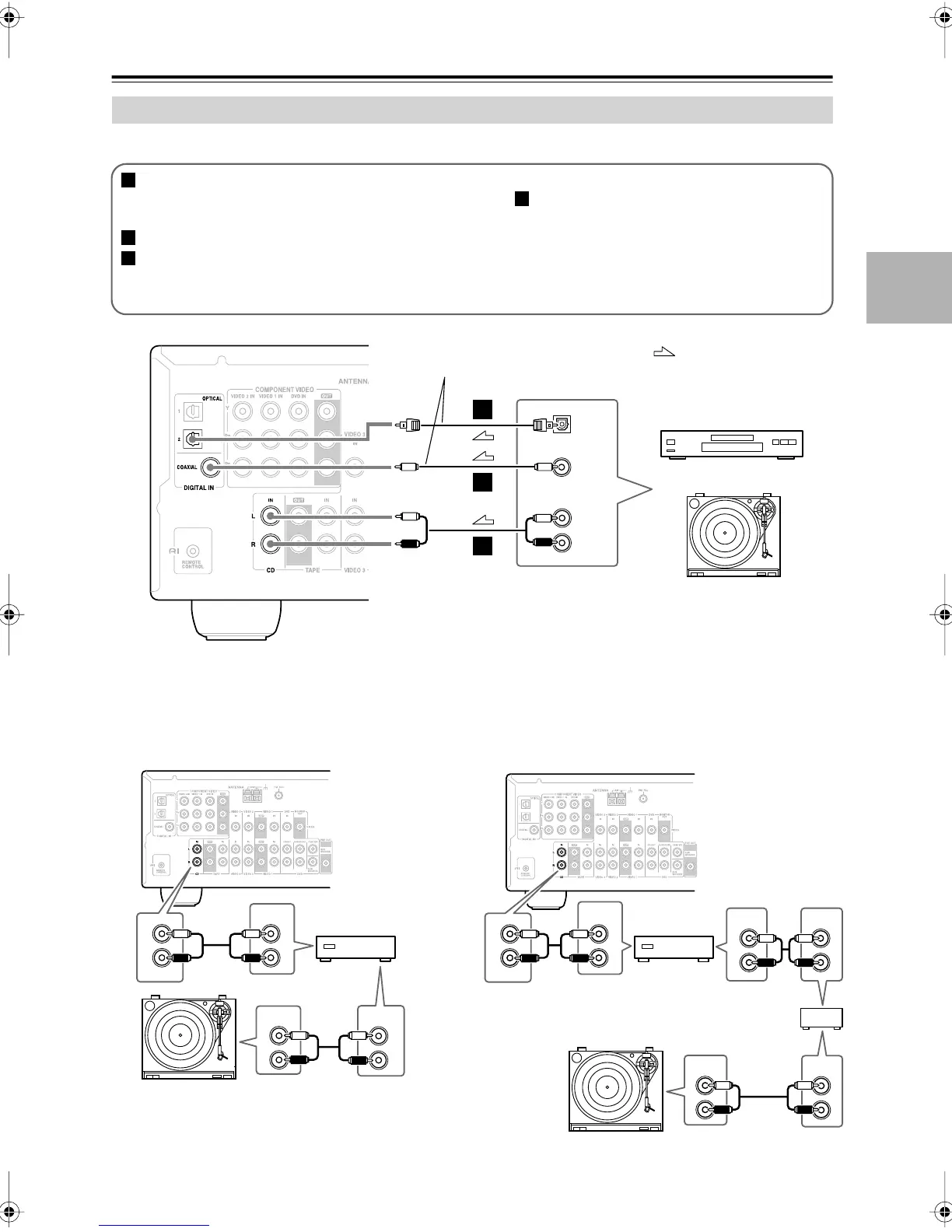 jacks to the AV receiver’s CD IN L/R jacks. With connection , you can listen to and record audio from the CD