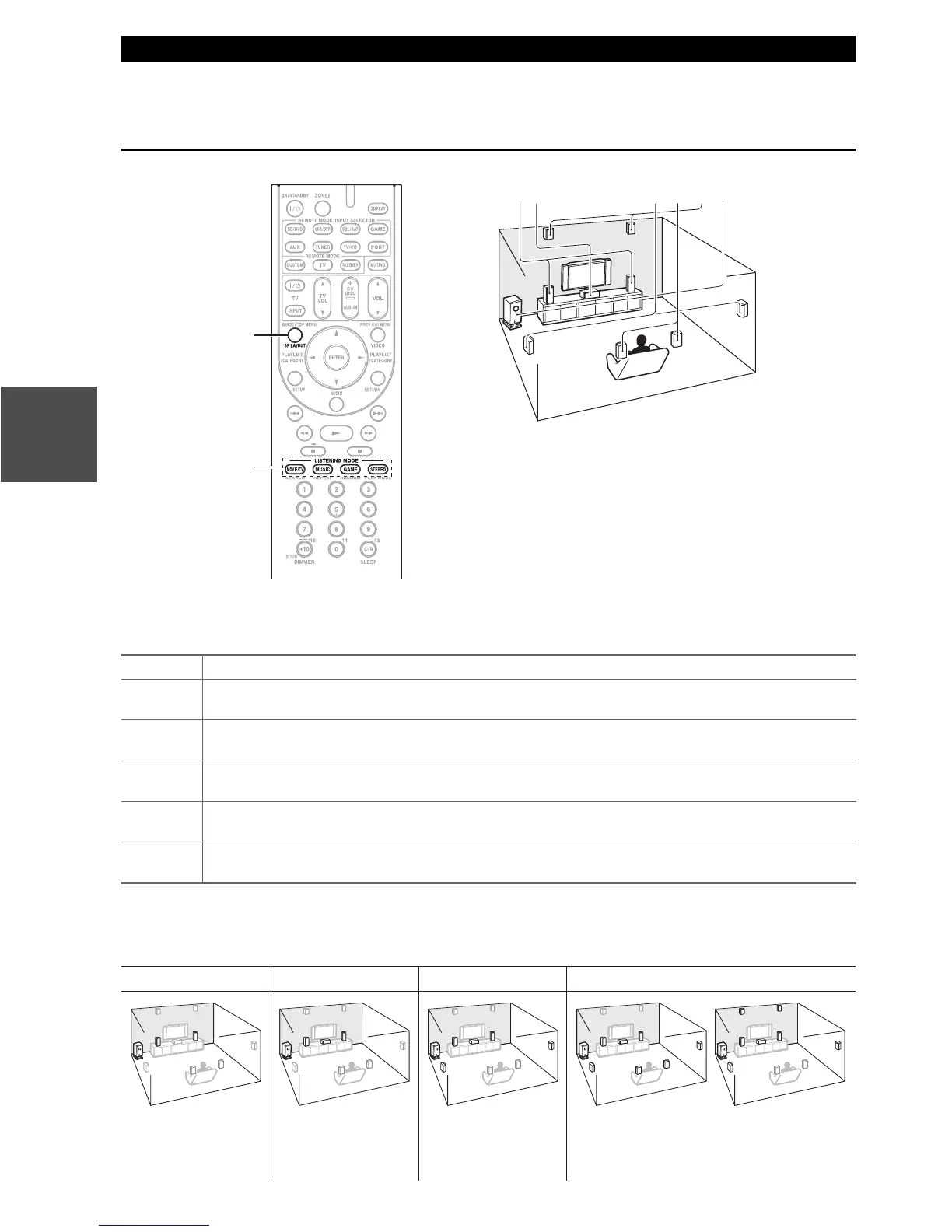 The illustration shows which speakers are activated in each channel. See “Sp Config (Speaker Configuration)” for the