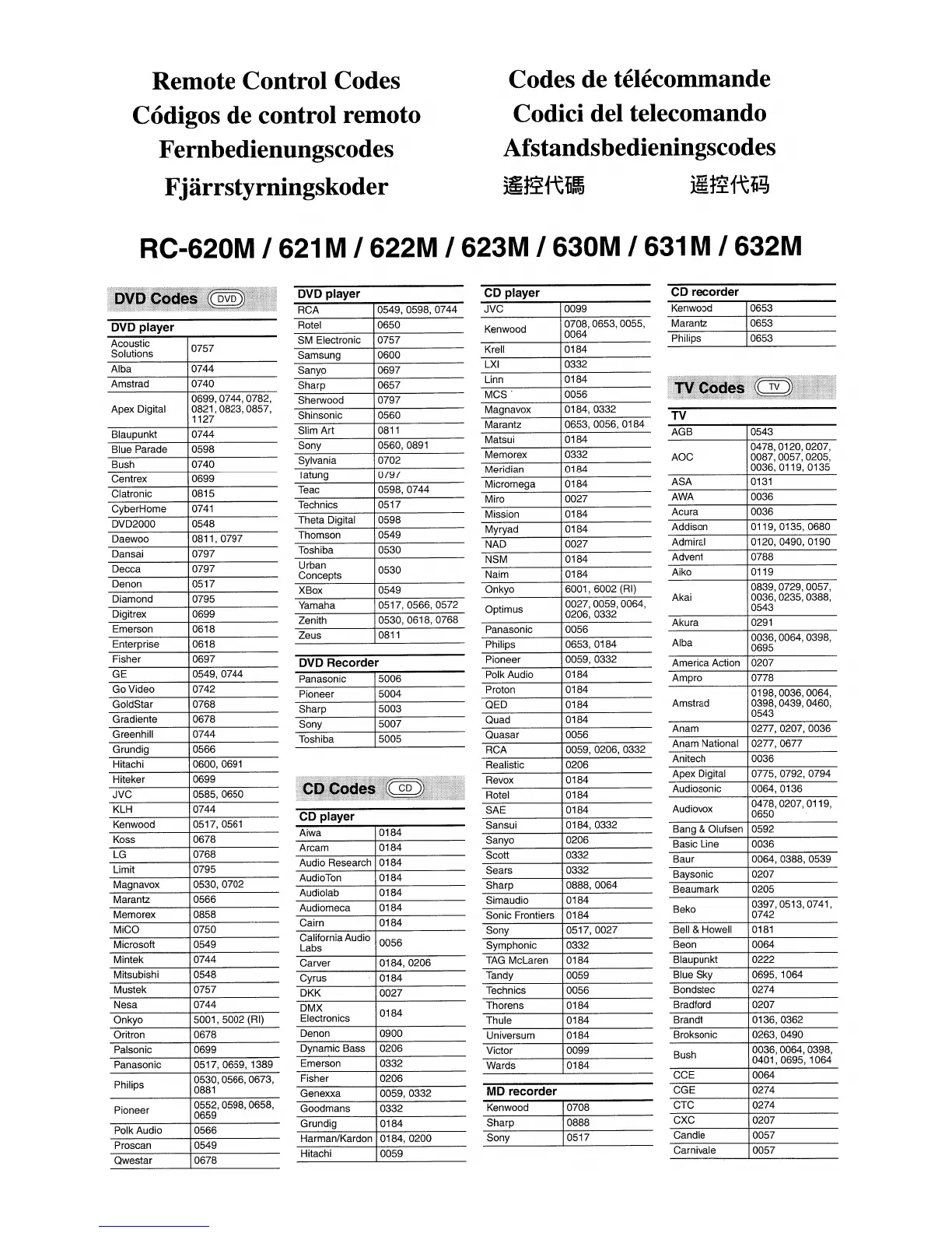 Onkyo TX-SR573 - Remote Control Codes List; Control Codes for Various Devices