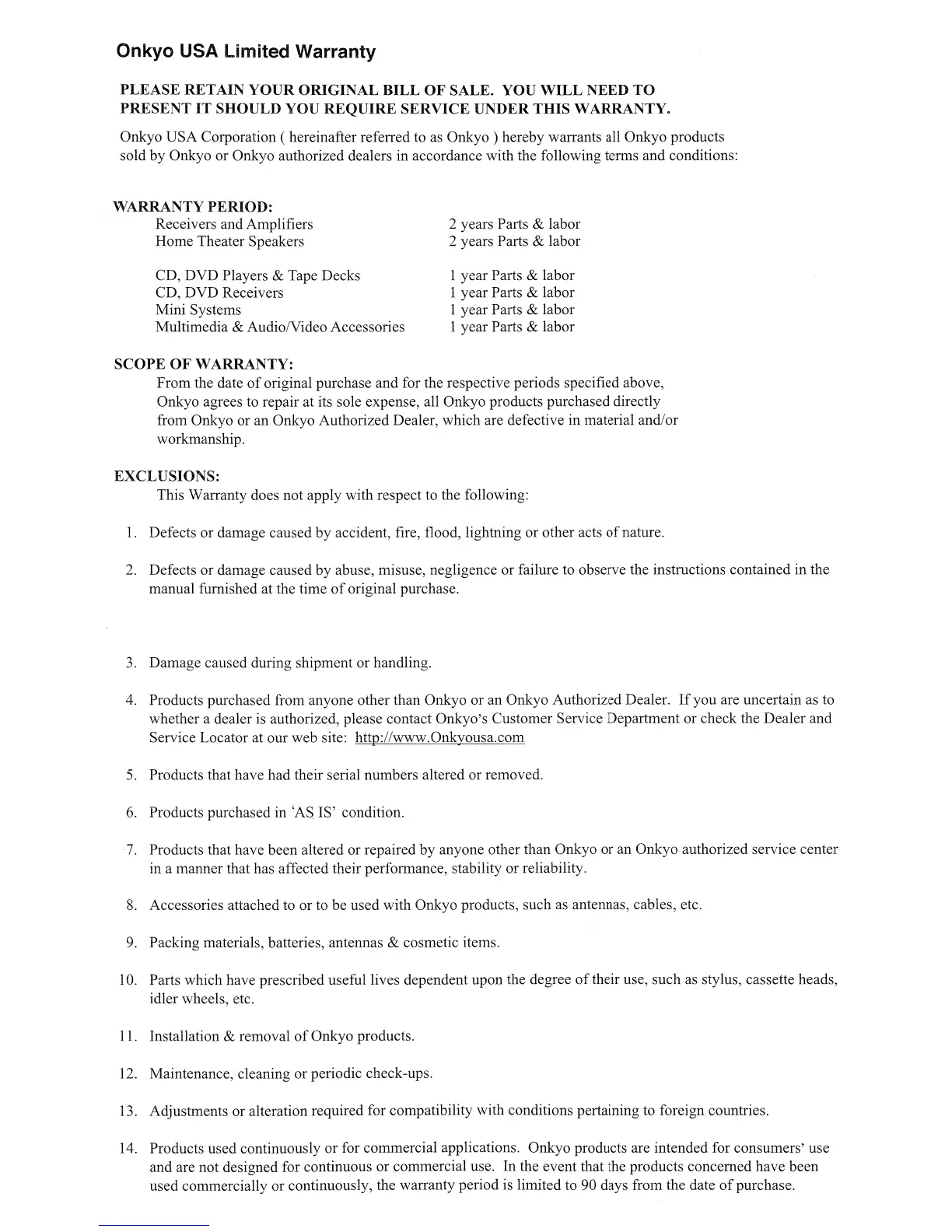 Onkyo TX-SR573 - Detailed Warranty Terms and Exclusions; Warranty Period, Scope, and Exclusions