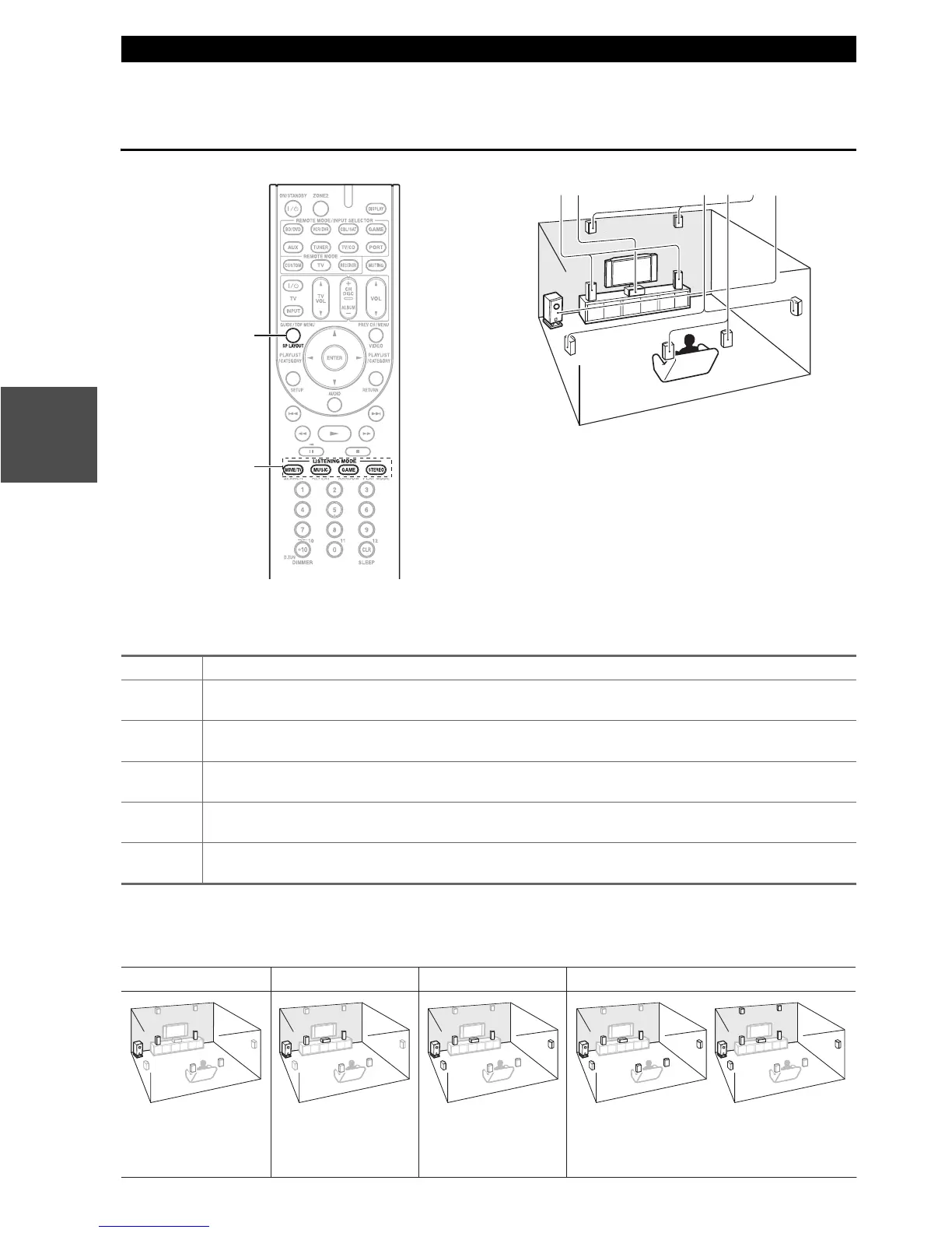 The illustration shows which speakers are activated in each channel. See “Speaker Configuration” for the speaker setup