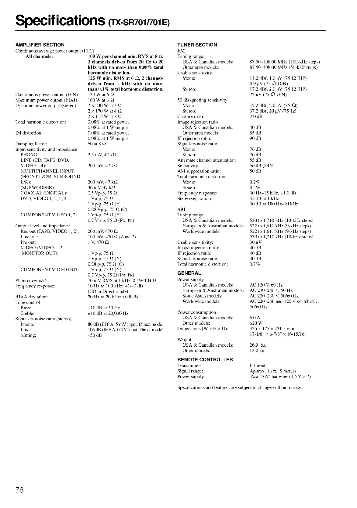 Specifications (TX-SR701/701E)