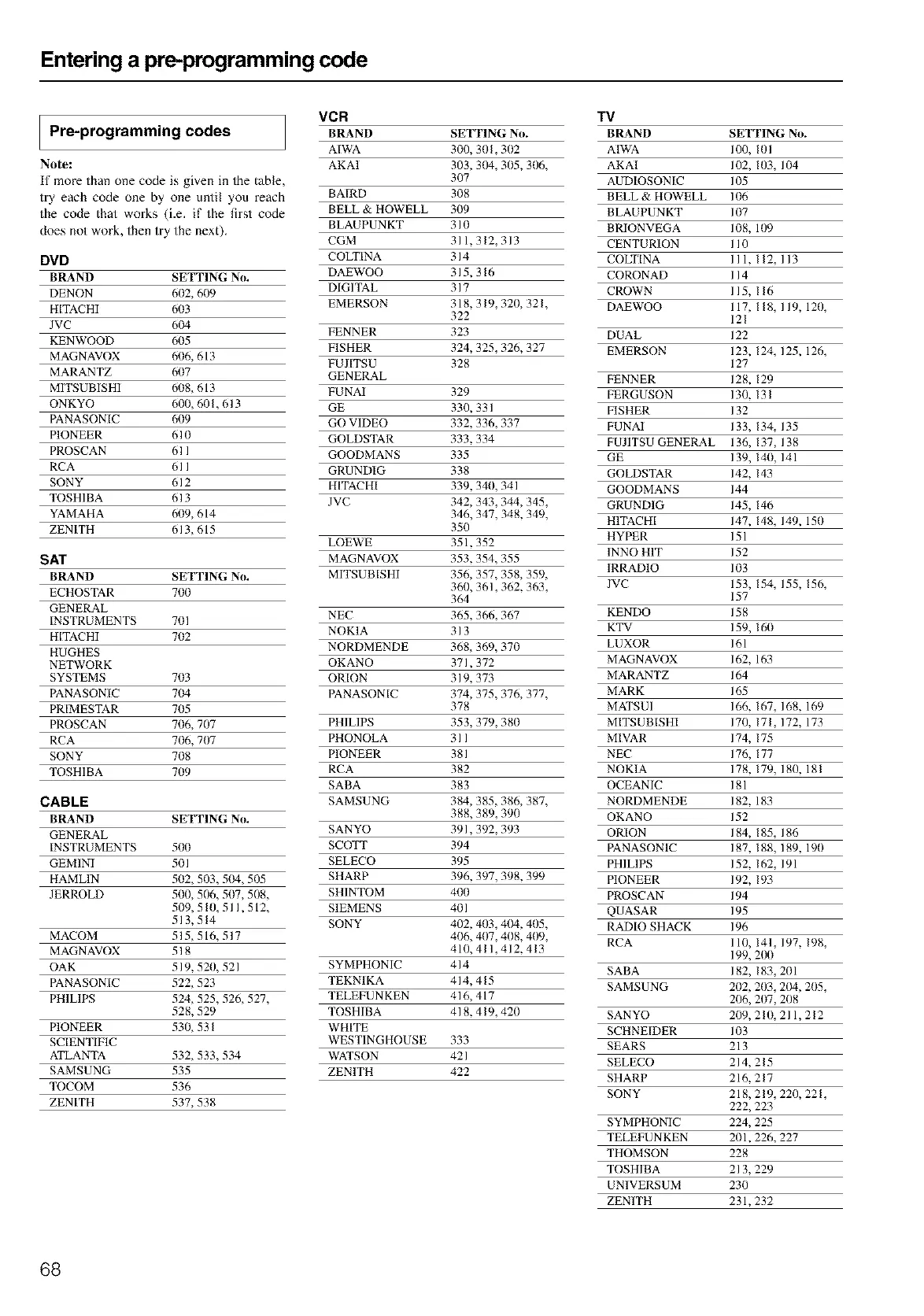 Pre-programming codes BRAND SETTING No. BRAND SETTING No.