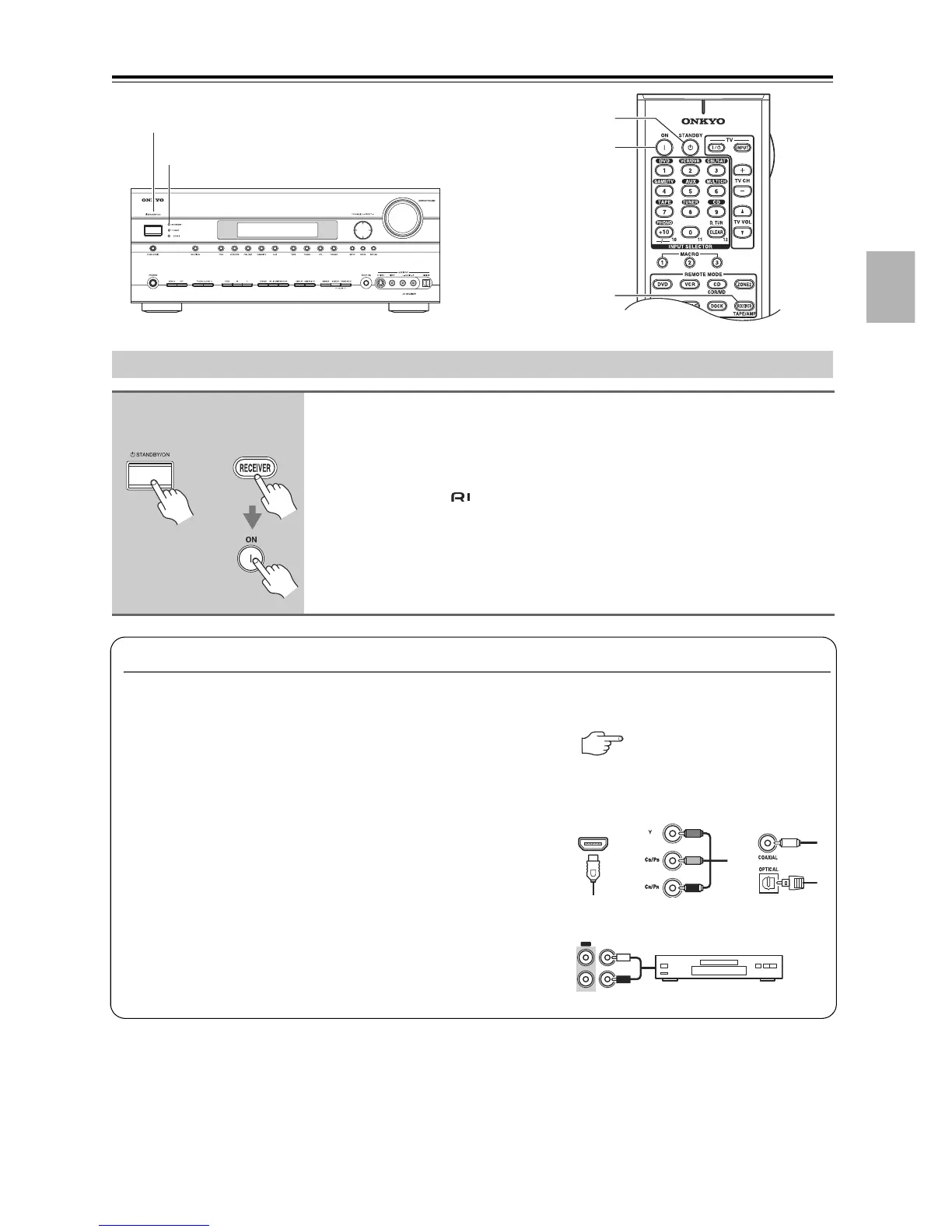 El receptor AV se activa, la pantalla se ilumina, y el indicador STANDBY se desactiva.