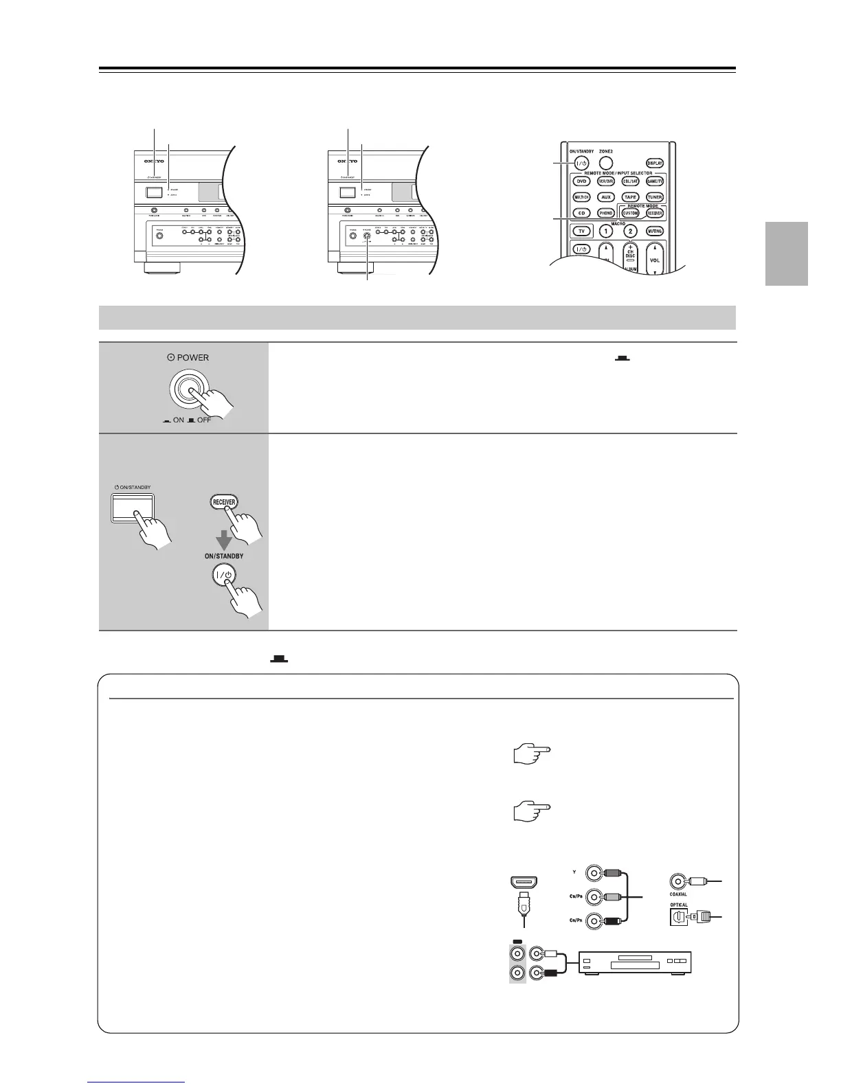 El Receptor de AV se activa, la pantalla se ilumina, y el indicador STANDBY se des-