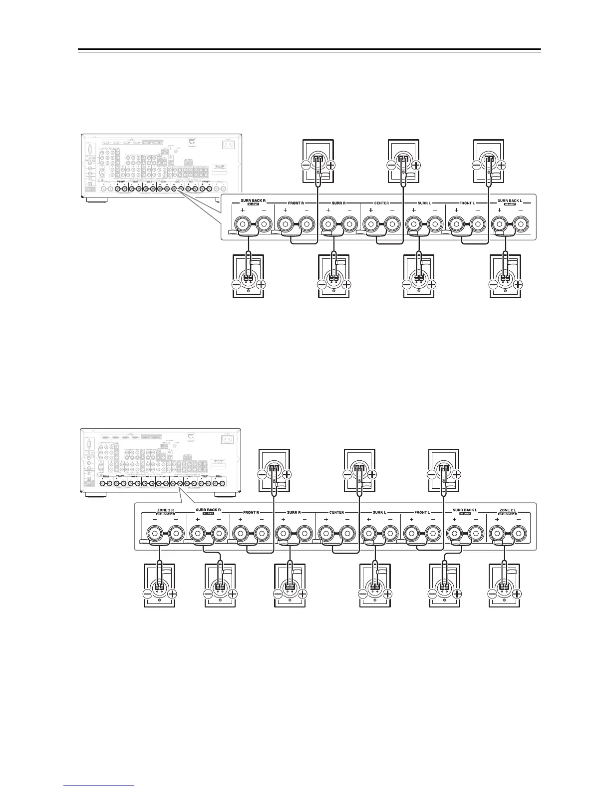 The following illustration shows which speaker should be connected to each pair of terminals for up to 7.1-channel