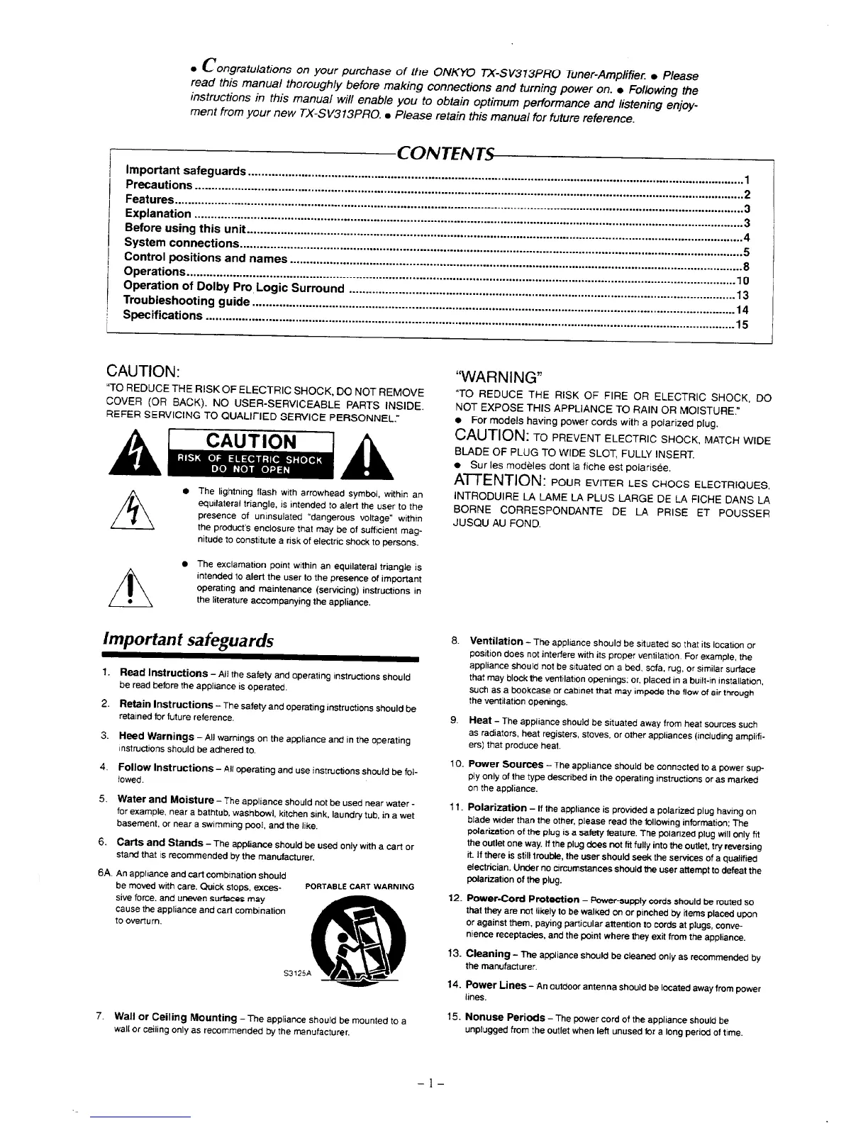 Onkyo TX-SV313 - Important Safeguards; General Safety Precautions; Environmental and Electrical Precautions
