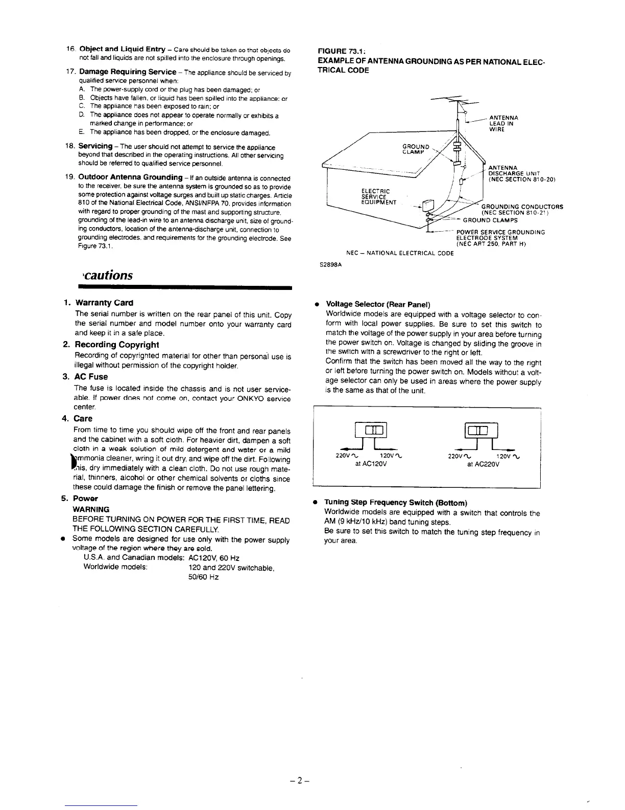 Onkyo TX-SV313 - Cautions and Care; Warranty and Unit Care; Power and Voltage Settings