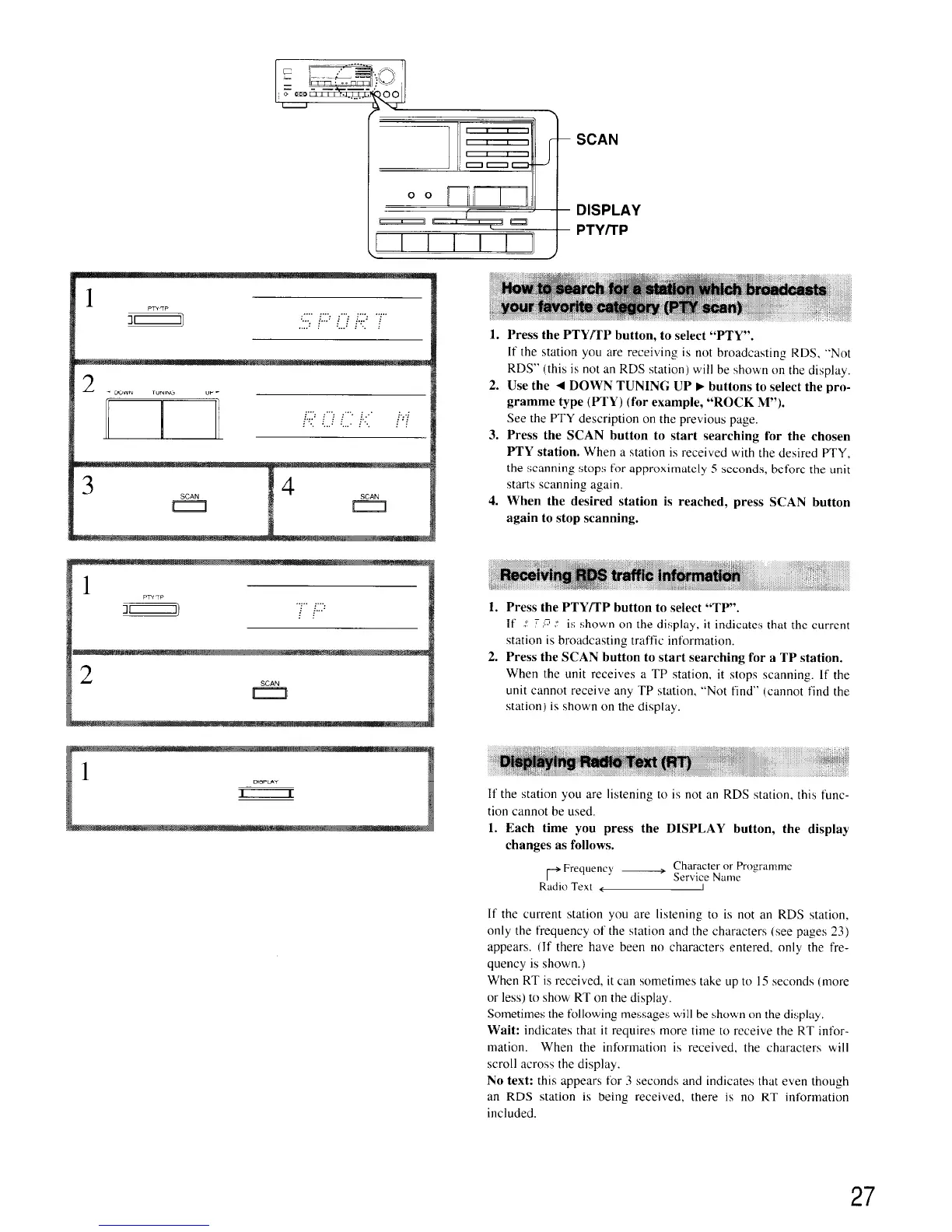 Onkyo TX-SV727 - How to Search for a Station Which Broadcasts Your Favorite Category (PTY Scan); Receiving RDS Traffic Information; Displaying Radio Text (RT)