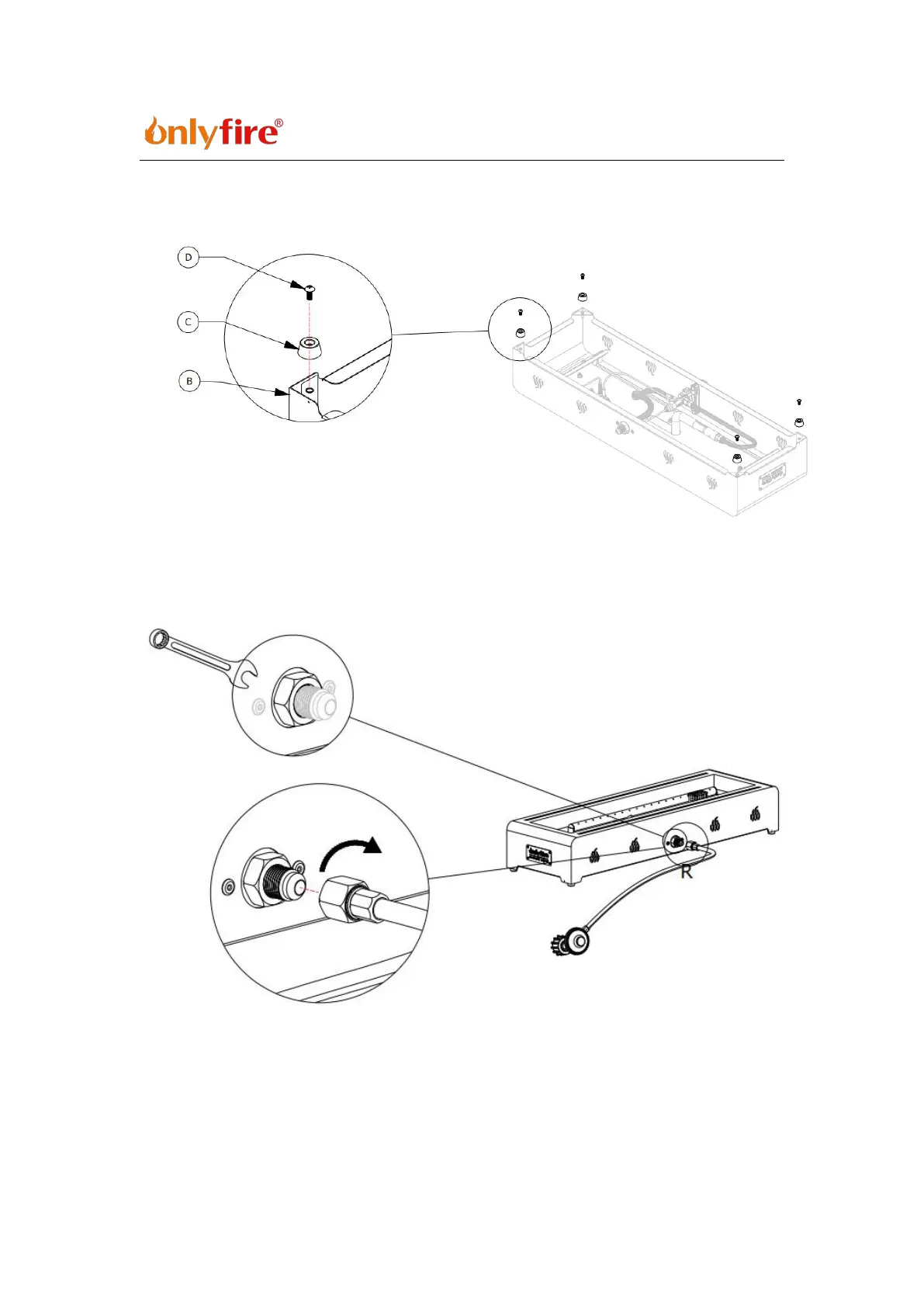 Étape 2: Fixez les 4 patins (C) avec des vis M4 (D )au fond du foyer (B). Assurez-vous de bien