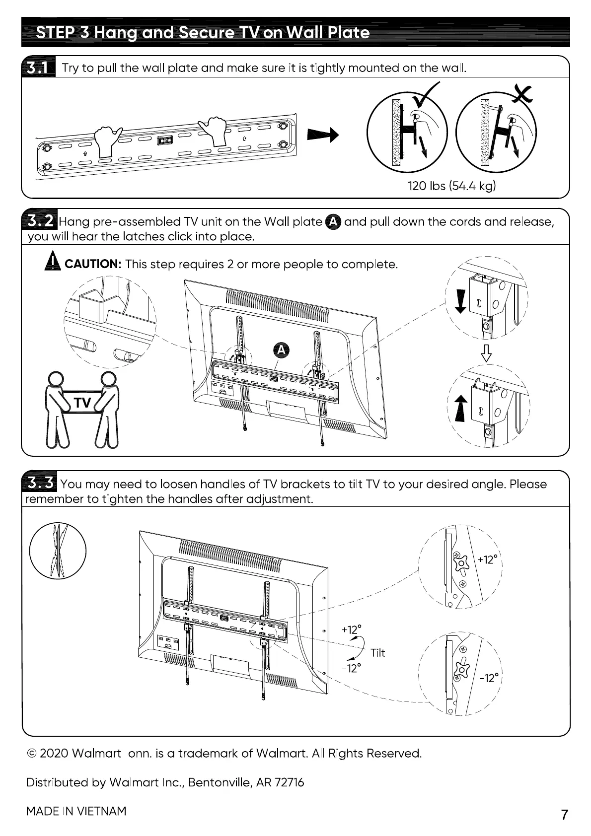 Onn 100010113 - STEP 3 Hang and Secure TV on Wall Plate; 3.1 Test Wall Plate Mount; 3.2 Hang and Secure TV; 3.3 Adjust TV Tilt Angle