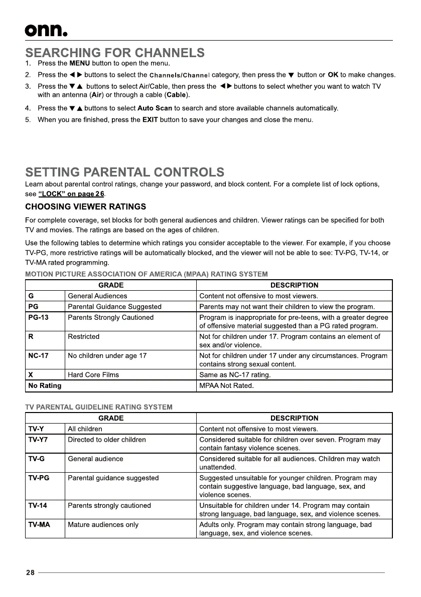 Onn 100013602 - SEARCHING FOR CHANNELS; SETTING PARENTAL CONTROLS