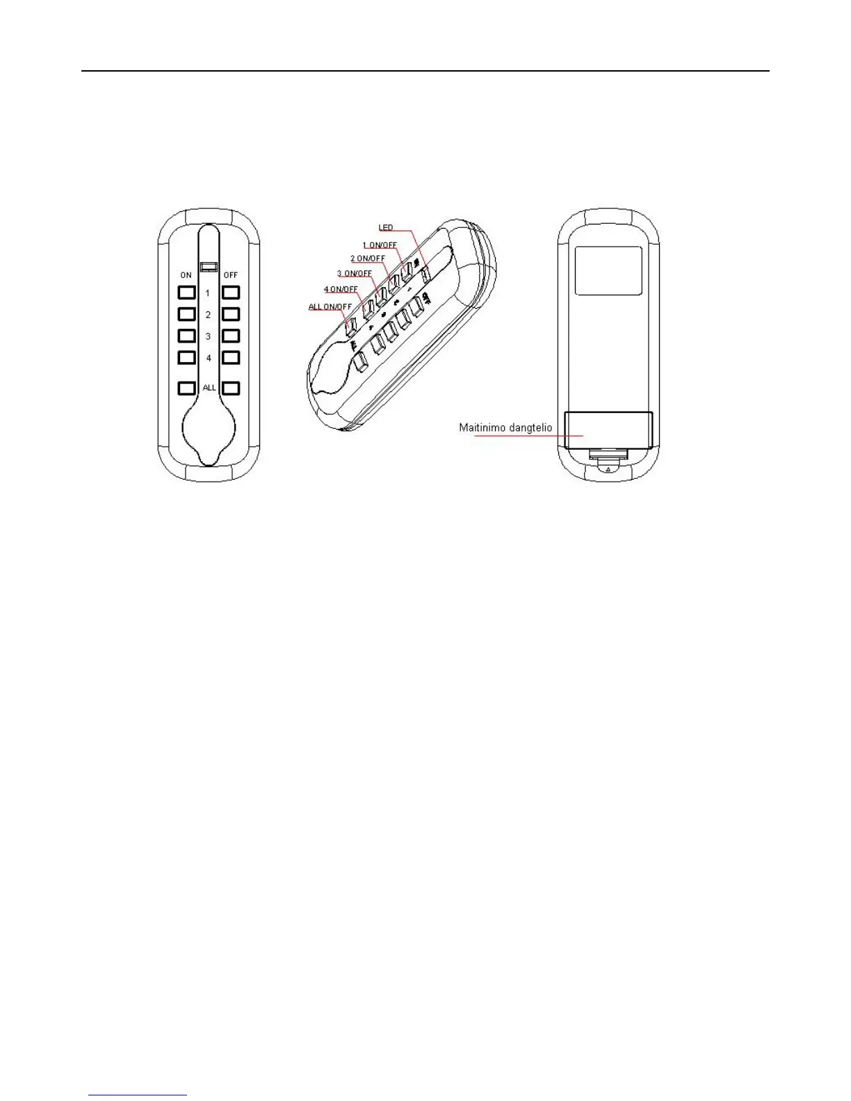 3) Kiekvienas siųstuvas gali kontroliuoti iki keturių kanalų (1ON, 1 OFF, 2ON, 2OFF ... ir tt). Kiekvienas kanalas gali