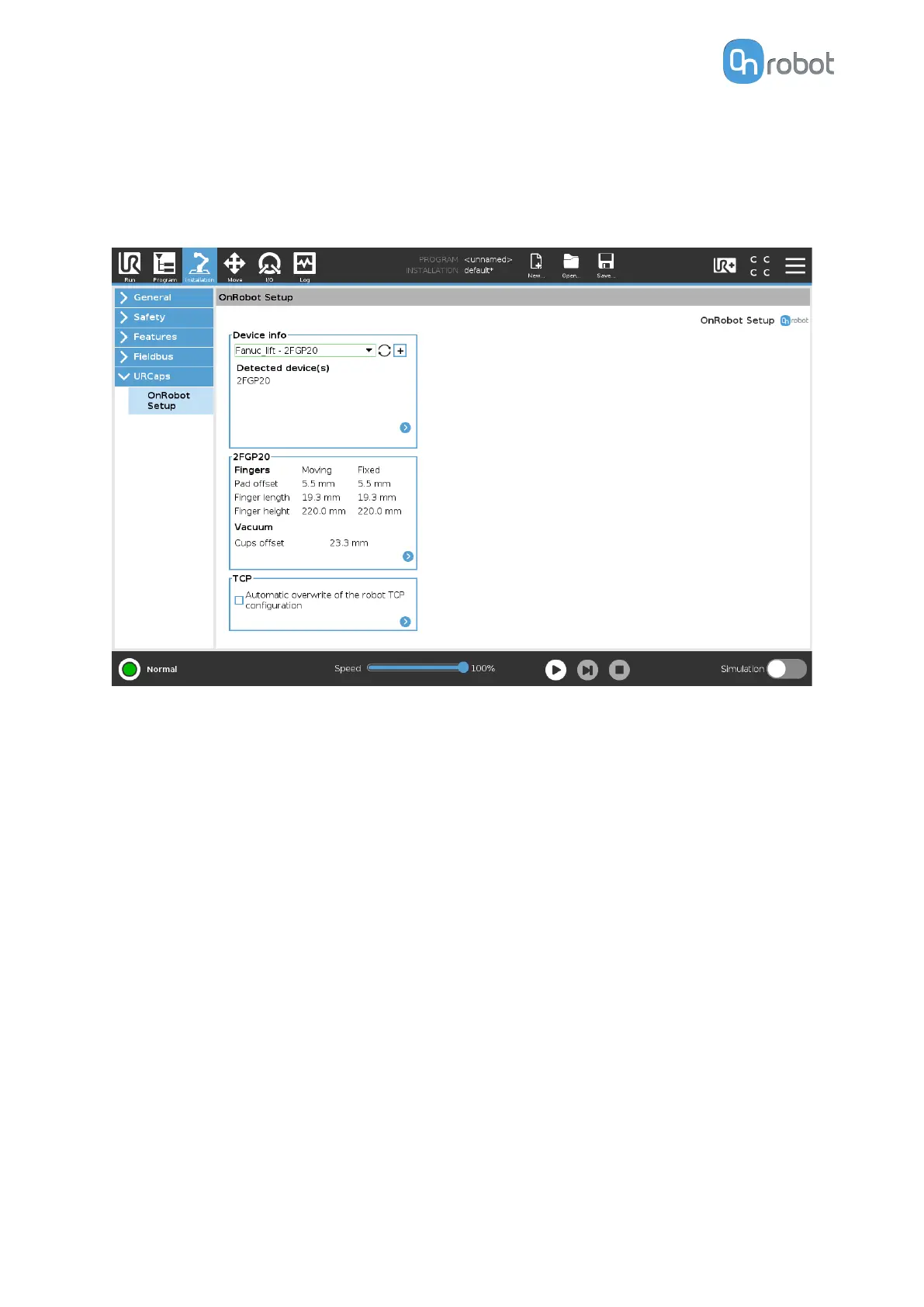 Vacuum cups oset are shown. These values can be set for both the Moving finger and the