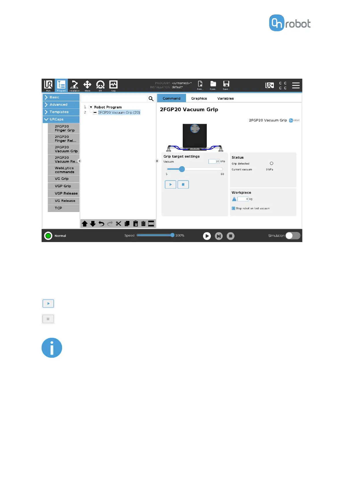 The 2FGP20 Vacuum Grip command is used to activate the pump and generate vacuum to