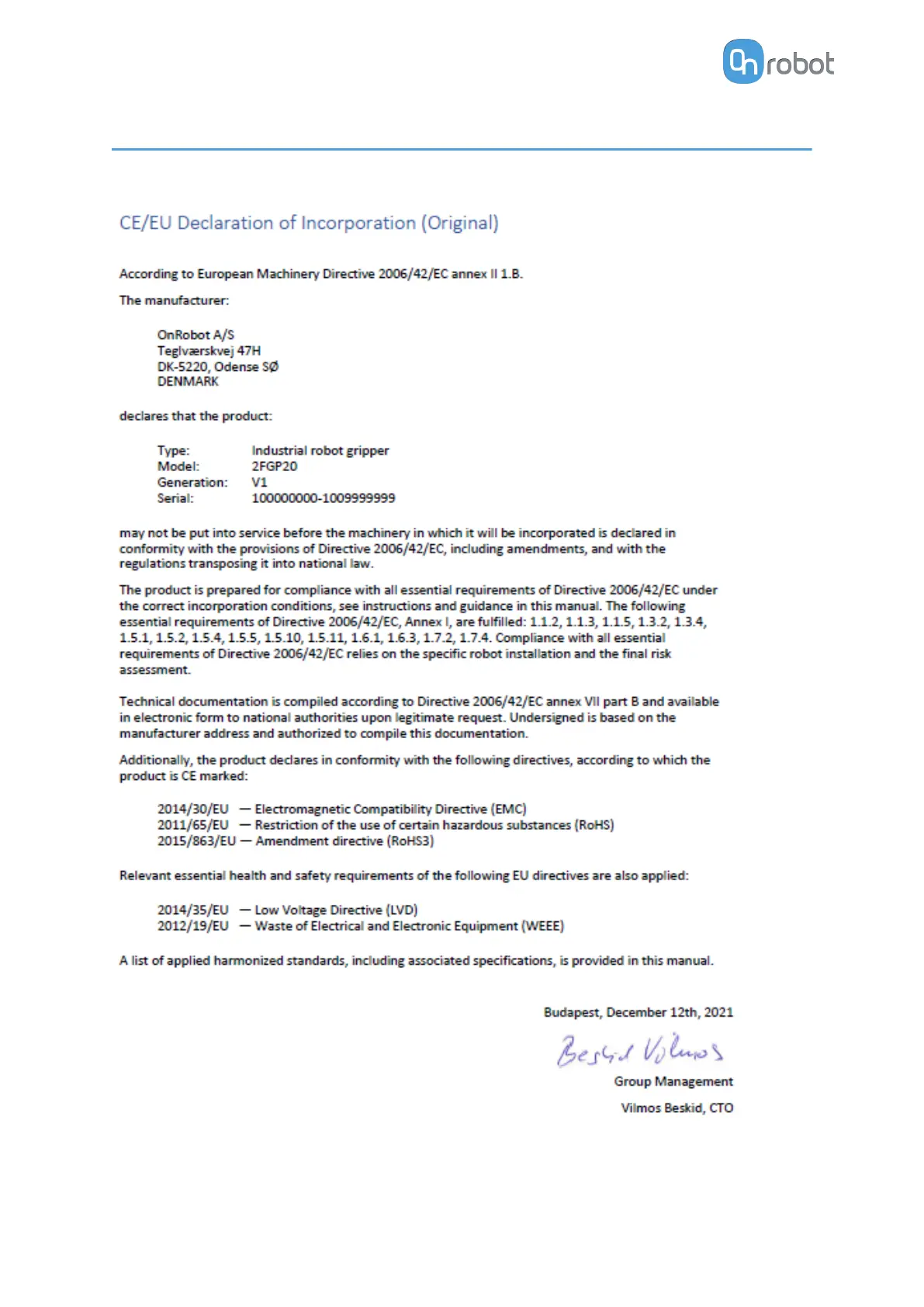 OnRobot 2FGP20 - Declaration of Incorporation; 2 Fgp20