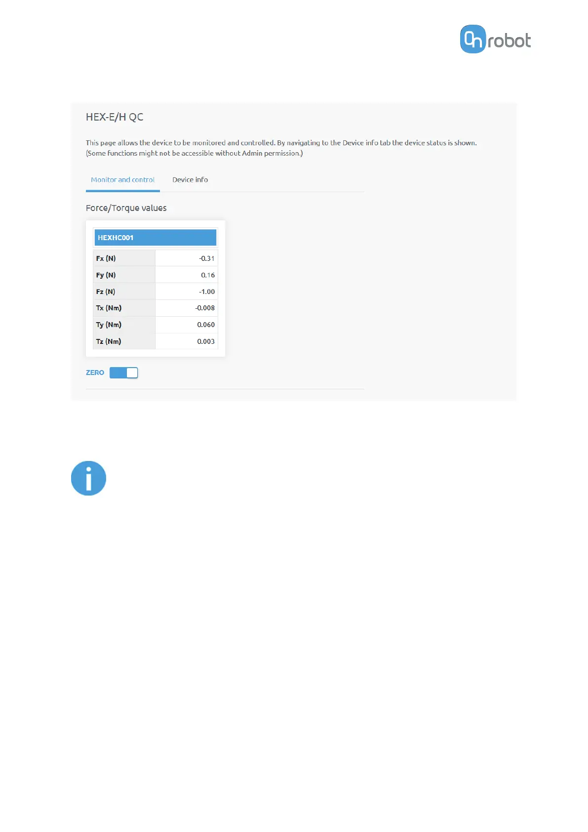 The Zero toggle switch can be used to zero the force and torque reading.