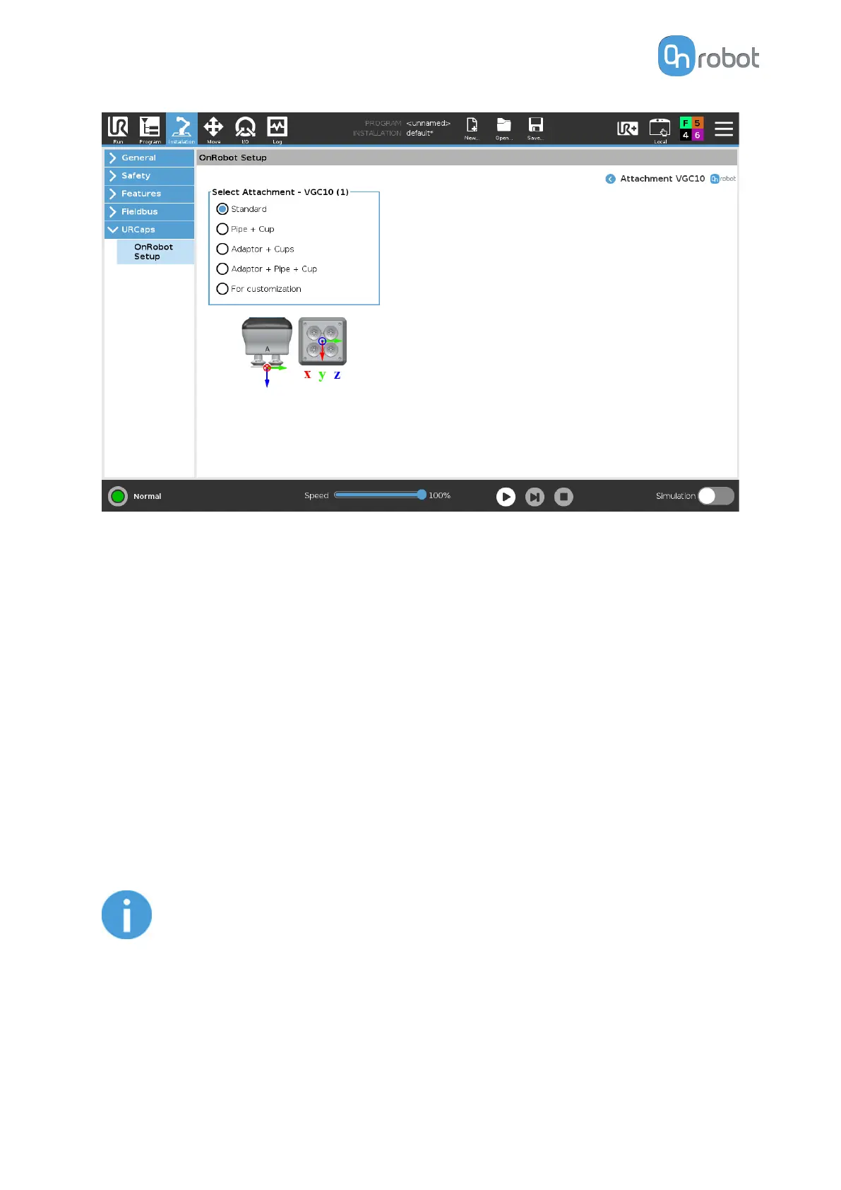 Here the actual mounting can be selected to set up the TCP correctly. The dierent options