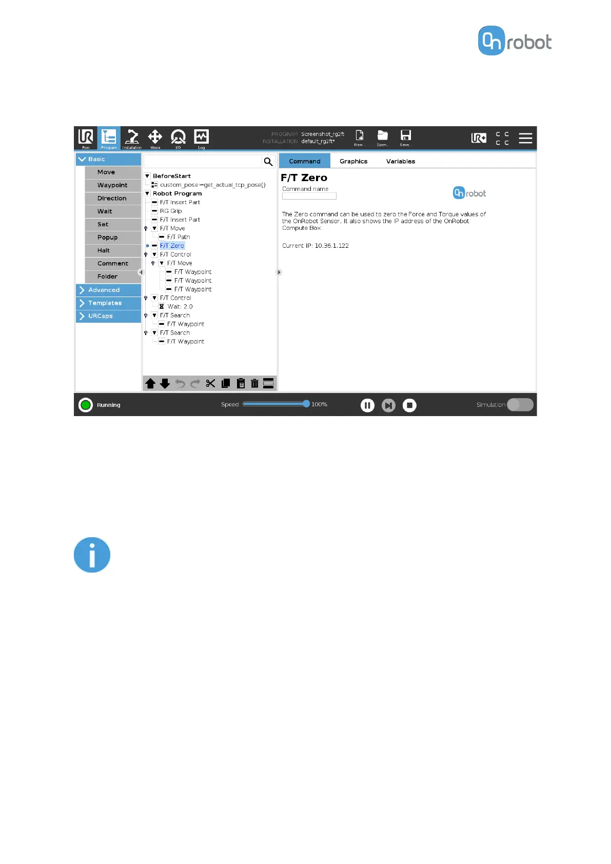 To cancel any force/torque oset, execute an F/T Zero at the beginning of the